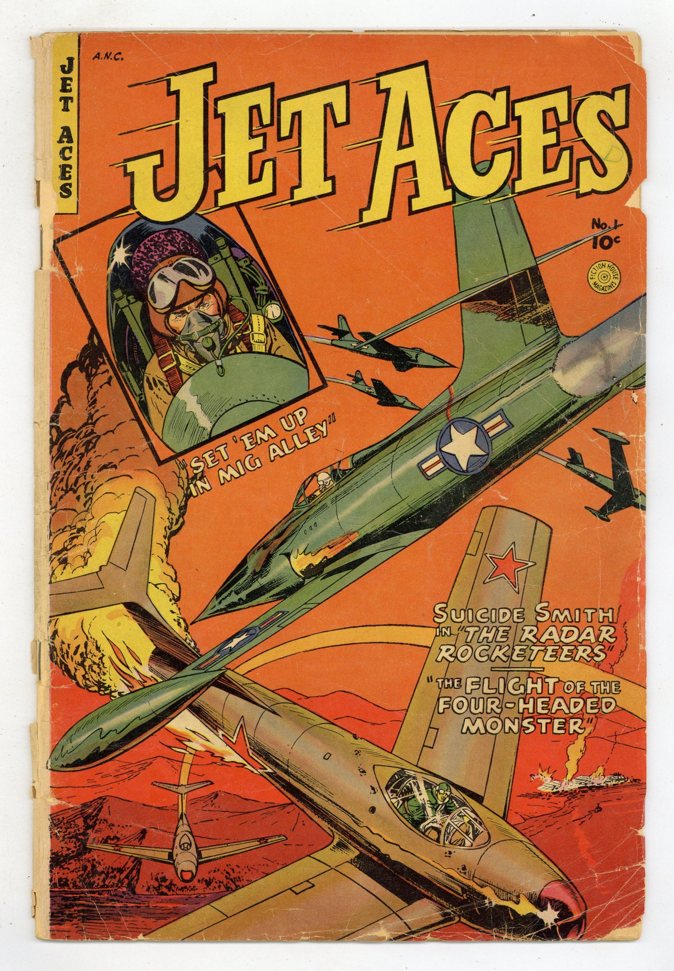 Stories and art by Jefferson Cole, Bill Discount, T.E. Bowen, A.E. Carruthers, Mark Mathews and Johnson Talmadge. Military aviation adventure produced during the peak of the Korean War. North Korean forces plague U.S. pilots with experimental flying saucers; A lone, downed pilot uncovers a secret weapon being prepared by the enemy; Suicide Smith takes a dangerous mission to free a U.S. general from a prison camp. Miracle from Mars; The Plague of the Flying Fish; Suicide Smith; Set 'Em Up in MIG Alley; The Flight of the Four-Headed Monster. 32 pages, Full Color. Cover price $0.10.