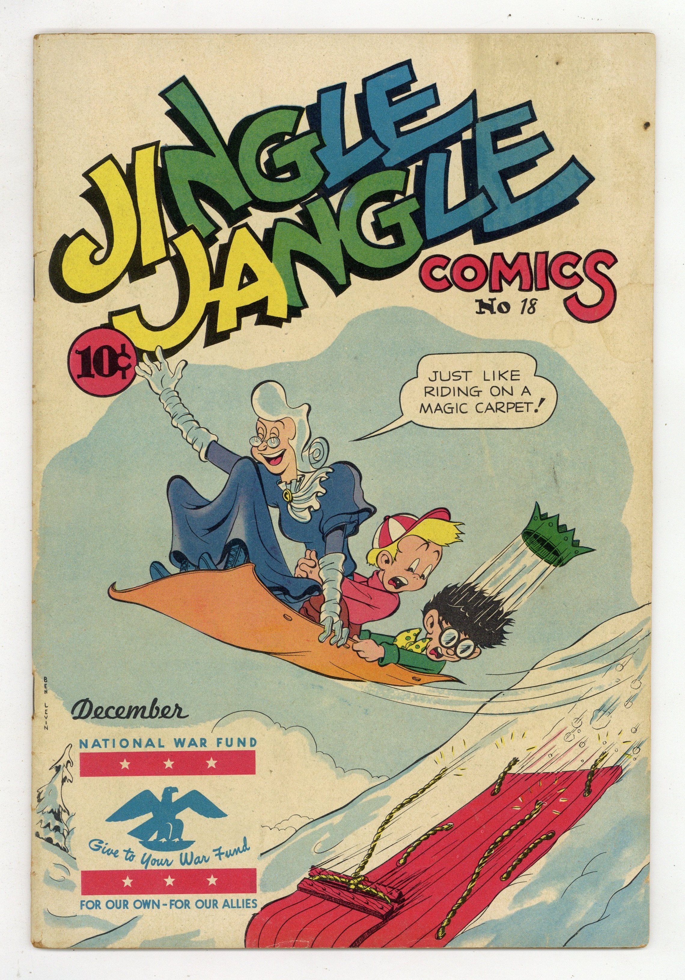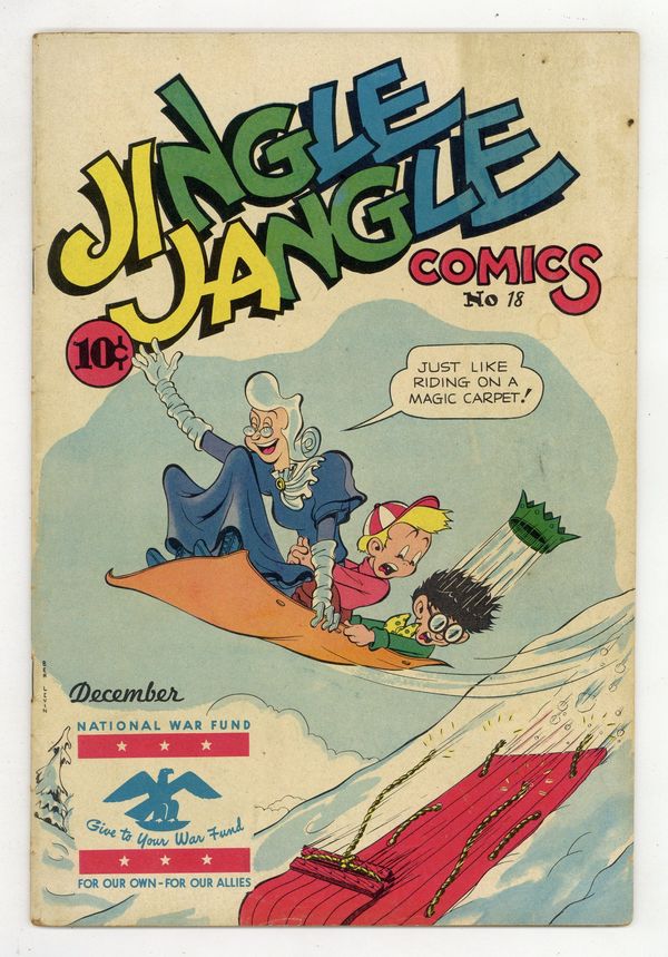 $22.00Stories and art by George Carlson, Dave Tendlar, Ben Levin, Mickey Klar Marks, and Sophie Ferstadt. Kids' comics featuring the whimsical fables of beloved artist George Carlson, praised by Harlan Ellison as a "comic of the absurd." A well-intentioned but not-too-bright Hunter and a Half-Varnished Duck have adventures on a Horseless Horse-Cart and a Floating Island. Another rare PSA (in puzzle form) by Carlson about saving paper for the war effort. Bingo and Glum try to save Christmas from The Man in the Moon. Bingo and Glum in Fairytale Land; Jingle Jangle Tales: The Honey-Hearted Hunter and the Half-Varnished Duck; Peter Mouse Presents; Aunty Spry; Chauncey Chirp and Johnny Jay; Waldo; The Puzzling Message; Rainbow-Colored Music with Magic Chart; Jewel House Thief. 32 pages, Full Color. Cover price $0.10.