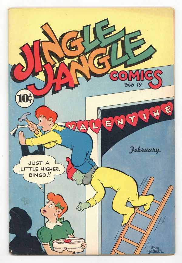 Cover art by Woody Gelman. "Strings Along His Customer," script and art by David Tendlar; Waldo brings his customer an order of shoestring potatoes. Untitled story, art by David Tendlar; Chauncey Chirp and Johnny Jay teach Humphrey Bohawk a lesson. Untitled story, art by Ben Levin; Aunty Spry and the kids enter a fishing competition. "Mary Had a Little Lamb"; Bingo and Glum attempt to get ivies from Baa Baa Black Sheep in order to heal Mary's Little Lamb. "About Bees and Elves" text story. "The Brass-Buttoned Baron and the Glamorous Cream-Puffs" featuring Jingle Jangle Tales, script and art by George Carlson. "Charlie Chameleon" text story by Mickey Klar Marks. Untitled Hortense the Lovable Brat story; An ant shows a lazy Hortense how hard working bugs are. Untitled story; Sir Razzo Razzh-Berri steals the Pie-Face Prince's squawk-o-varius fiddle. 52 pgs., full color. Cover price $0.10.