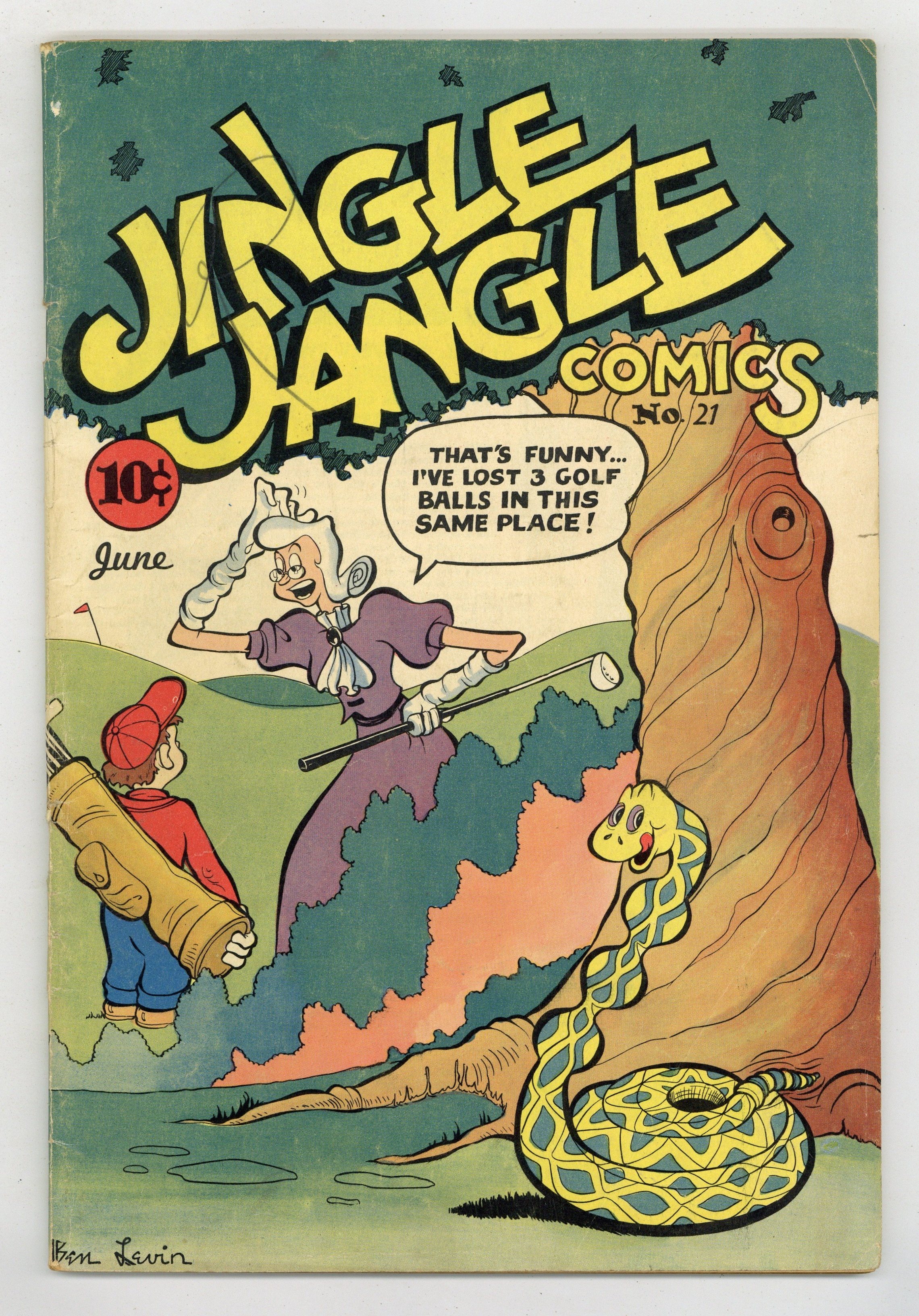 $32.00Cover by Ben Levin. Stories and art by George Carlson, Dave Tendlar, Allen Ulmer, Larz Bourne, and Doug Anderson. Kids' comics featuring the whimsical fables of beloved artist George Carlson, praised by Harlan Ellison as a "comic of the absurd." After he over-waters his Hat-Tree, a Banker must contend with a Magpie and a Pirate to get his fortune back. Ventriloquist The Great Gabboo provides a voice to Ventro the dummy without moving his lips. Rajah Razzo Razzh-Berri and the Green Witch fall into each other's traps while Princess Panatella Murphy saves the Royal Teapot. Also featuring an ad for Pepsi-Cola starring "Pepsi the Pepsi-Cola Cop." Bingo and Glum in Fairytale Land; Chauncey Chirp and Johnny Jay; Jingle Jangle Tales: The Double-Rich Banker and the Well-Watered Hat-Tree; Penny the Penguin; Hortense the Lovable Brat; Seminole Sam; Ventro, a Talkative Marionette; Aunty Spry; The House with the Violet Eyes; The Pie-Face Prince of Old Pretzleburg. 48 pages, Full Color. Cover price $0.10.