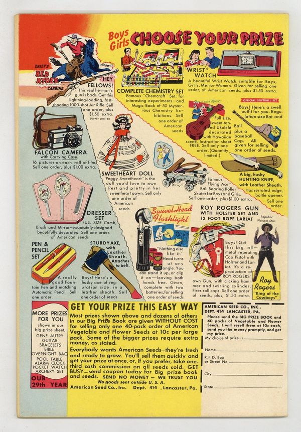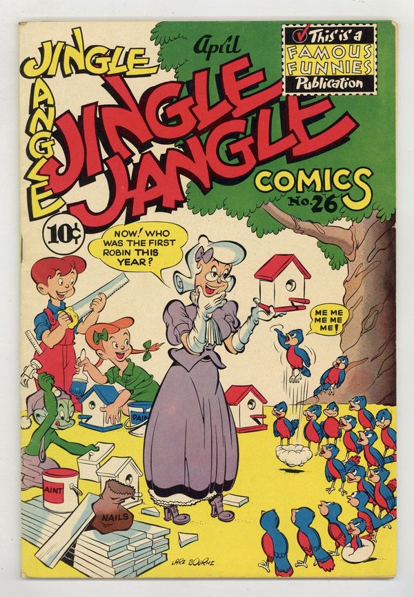 $35.00Cover by Larz Bourne. Stories and art by George Carlson, Larz Bourne, David Tendlar, Ray Willner and Allen Ulmer. Kids' comics featuring the whimsical fables of beloved artist George Carlson, praised by Harlan Ellison as a "comic of the absurd." When Egg-Face Ike and Uncle Schmaltz steal a MacGuffin, a tailor's Bargain-Plated Dummy comes to life to get it back. Bingo and Glum help Jason regain the Golden Fleece. Another mad chase for The Pie-Face Prince and Princess Panatella Murphy involves a message in a bottle, an uncle's treasure and a call to the Pretzleburg Fire Department. Bingo and Glum in Fairytale Land; Chauncey Chirp and Johnny Jay; Jingle Jangle Tales: The Bargain-Plated Dummy and the Non-Skid Dicky; Lil' Bimbo; Hortense the Lovable Brat; Footsie; Barn and Yard Race; Aunty Spry; Torchy Toaster; Dear Ol' Pop; The Pie-Face Prince of Old Pretzleburg; The Old Swap Shop. 48 pages, Full Color. Cover price $0.10.