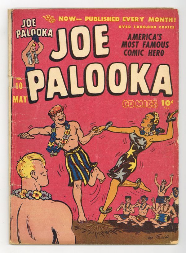 Cover by Ham Fisher (credited). Stories and art by Ham Fisher, Menrola, Salo, Bo Brown and Bob Powell. Ham Fisher's comic-strip boxer has adventures both inside and outside the ring. In the South Pacific, Joe and Jerry are captured and tortured by Nazis on the Dutch plantation, but Polynesian refugee Melody enlists the Malaysian tribespeople to mobilize a revolt. Flyin Fools Chickie and Gootch are enlisted by the beautiful Maylene the Tigress to free her father and join rebels fighting for the freedom of her tiny Himalayan nation. Plus a prose adventure of early female superhero Black Cat. Joe Palooka: Fight for Life; Jungle Jamboree; Homeward Bound; Black Cat: Death on the Set; Flyin Fool: A Trip to Trouble; Ricky Roony; Cartoon Laughs. 48 pages, Full Color. Cover price $0.10.