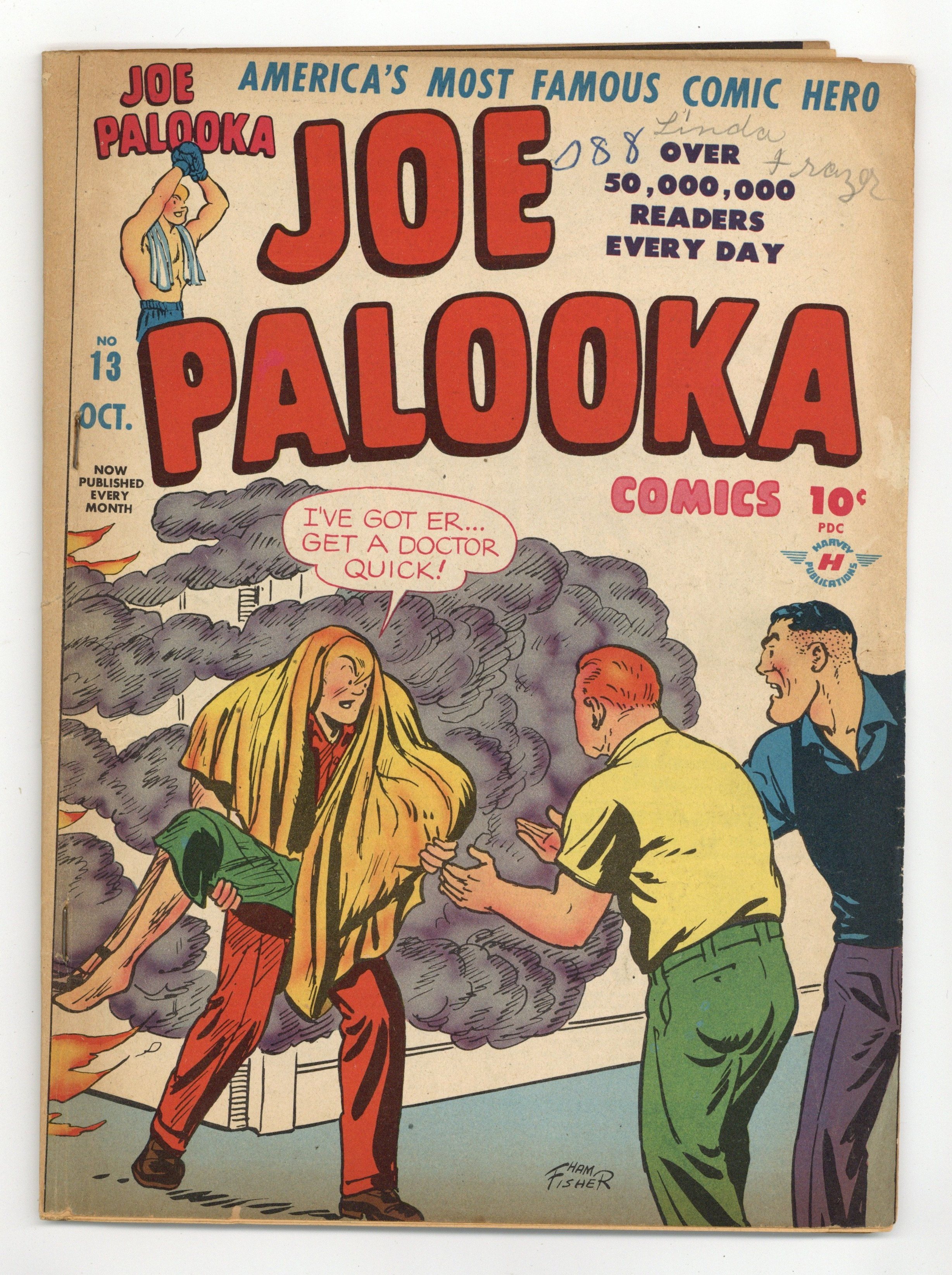 Cover by Ham Fisher (credited). Stories and art by Ham Fisher and Bob Powell. Ham Fisher's comic-strip boxer has adventures both inside and outside the ring. While training for his fight with Phantom Dill, Joe is marked for death by a mysterious figure. Chickie and Gootch set out to rescue Maylene's uncle from the forbidden city of Bal. Plus two prose adventures of early female superhero Black Cat. Joe Palooka; Black Cat's Visit of Mercy; Flyin Fool; Boxing Course - Lesson Five; Black Cat: The Duel. 48 pages, Full Color. Cover price $0.10.