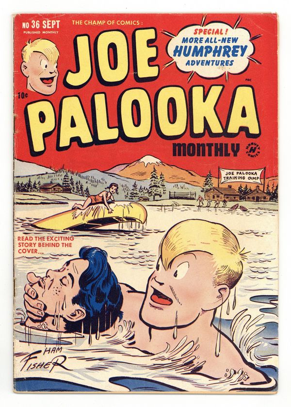 $17.50Joe Palooka in "Hollywood Films the Palooka Story" and "The Birth of a Champion." Little Max and Humphrey back-up stories. Back-up baseball story, "True-Thrilling Sport Short: Bob Lemon" (art by Bob Powell; 2 pages). One-page Tootsie Roll ad, "Captain Tootsie to the Rescue!" by C.C. Beck. Cover price $0.10.