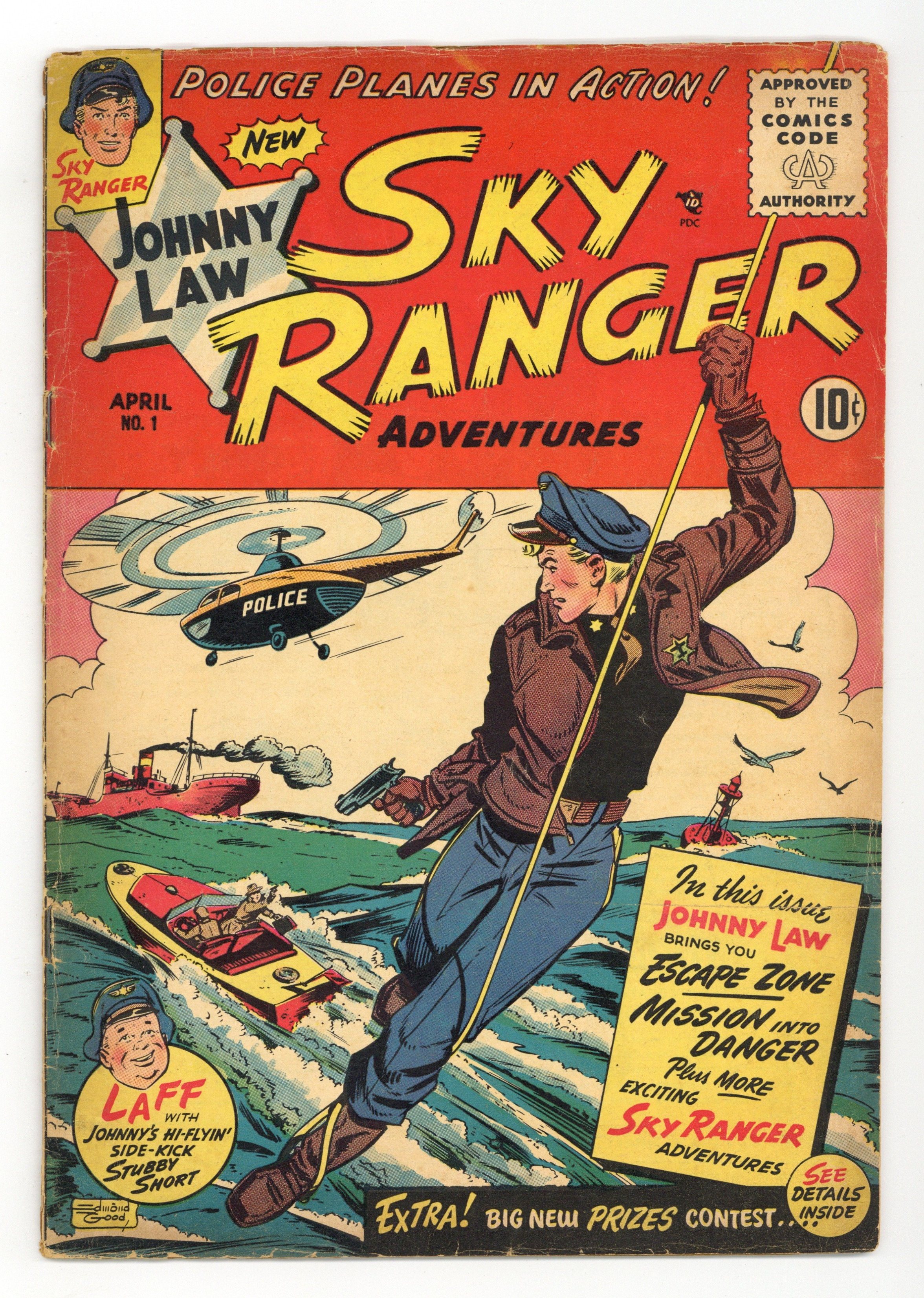 Cover by Edmond Good. Stories and art by Edmond Good and Carl Hubbell. Johnny Law and his sidekick Stubby belong to the Aero-Police, part heroic aviators and part government agents. After introducing themselves to the readers, Johnny and Stubby battle gangsters holed up in a mine in a Western town. Johnny must stop foreign agents from stealing Dennis's Atom Jet plans. Buzzy and Betty Bean find an abandoned flying saucer and take it for a spin, startling nearby jet crews. Johnny Law; Mission into Danger; Escape Zone; History Highlights of Flight; Buzzy Bean and His Flying Saucer; Operation S.O.S.; Counterfeit Showdown. 32 pages, Full Color. Cover price $0.10.