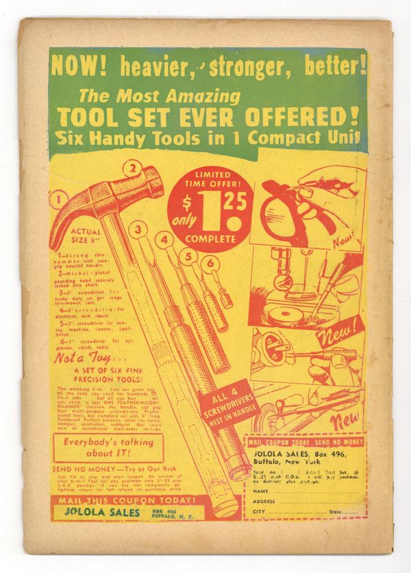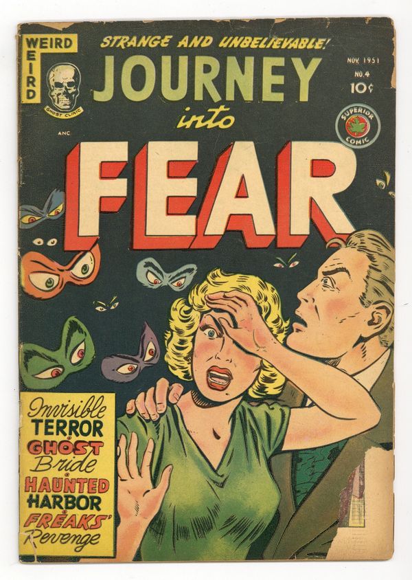 Ghost Bride!; a rich mans wife dies and comes back. Invisible Terror; Betsy Ward moved into another womans house, but she was never permitted to forget she was unwelcome, unwanted, and unsafe. The Haunted Stairs/Farmer's Oath/The Clutching Keys text story. Haunted Harbor; a mermaid ghost story. Freak's Revenge!; Mona Larson is the proprietress of a lodging home for creatures that a carnival employs as freaks. 36 pgs. $0.10. Cover price $0.10.