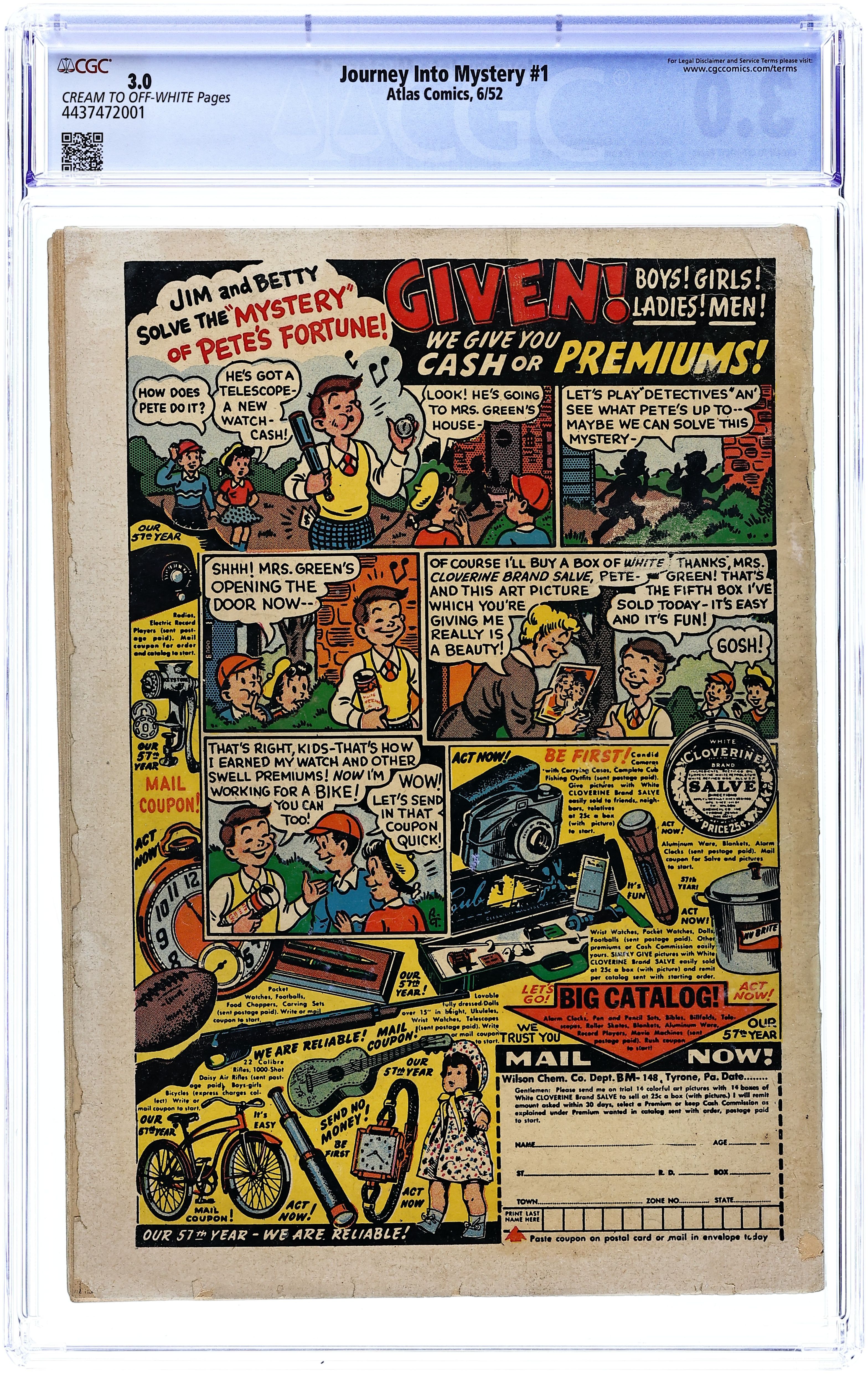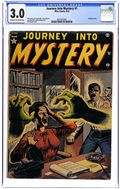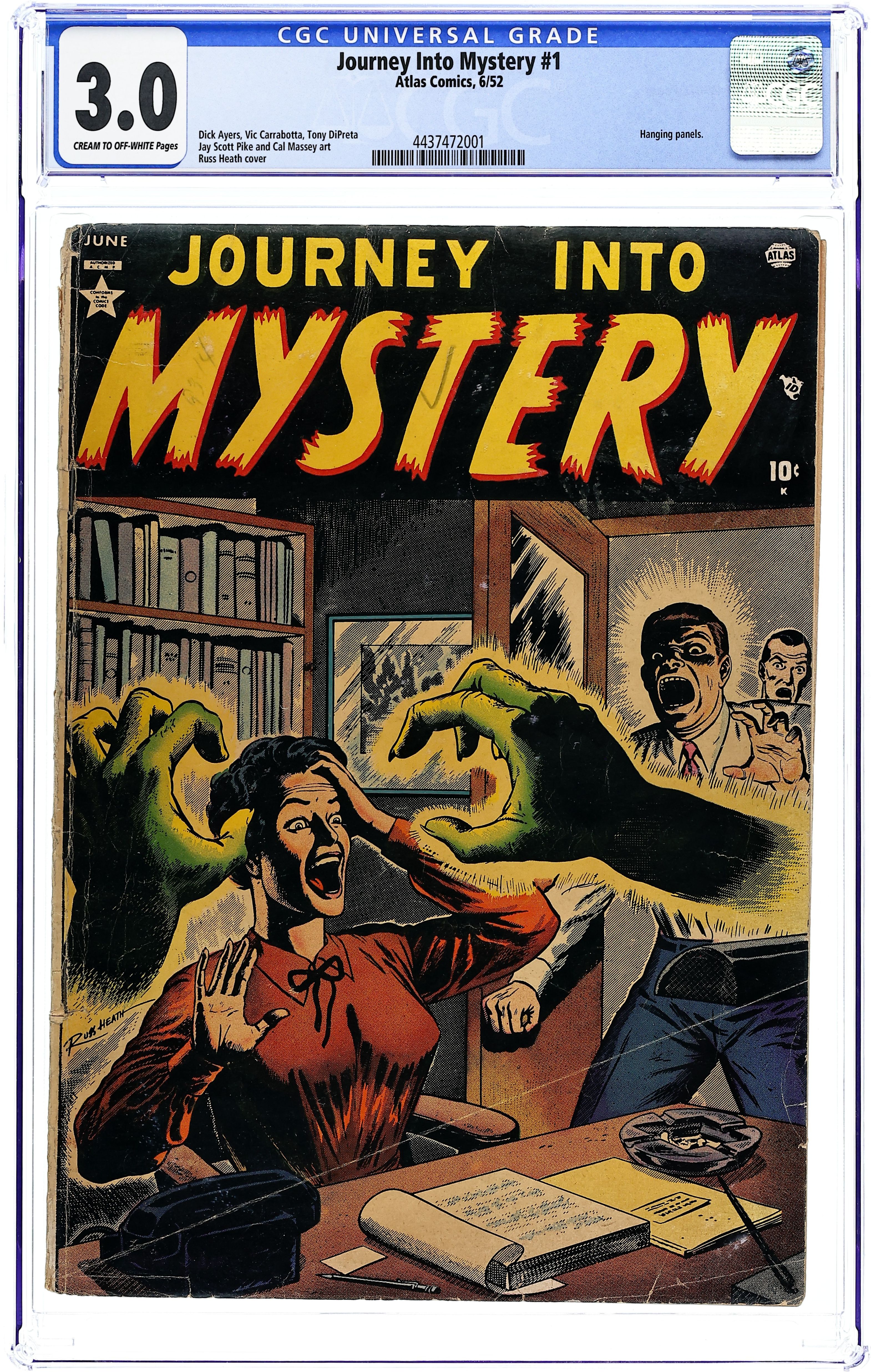 Cover by Russ Heath. "One Foot In the Grave," art by Tony DiPreta; A man decides to make money by reselling flowers stolen from graves until the dead return to take their flowers back. "Death Finds A Way!" text story. "The Clutching Hands," script by Carl Wessler, art by Cal Massey; A writer murders another writer to steal his work, but the dead writer's hands continue to make trouble for him. Haunted!, art by Vic Carrabotta; A ghost scares off potential buyers of a derelict house. "It Can't Miss," art by Jay Scott Pike; An accomplice to an escaped con kills a man who looks like his buddy so that the cops will find the body and think the escaped prisoner is dead while he assumes the dead man's identity. "Iron-Head," art by Dick Ayers; Bronson is a grave robber and a murderer; To avoid being captured by the authorities, he accepts a job as a deep-sea diver on a private yacht. 36 pgs., full color. $0.10. Cover price $0.10.