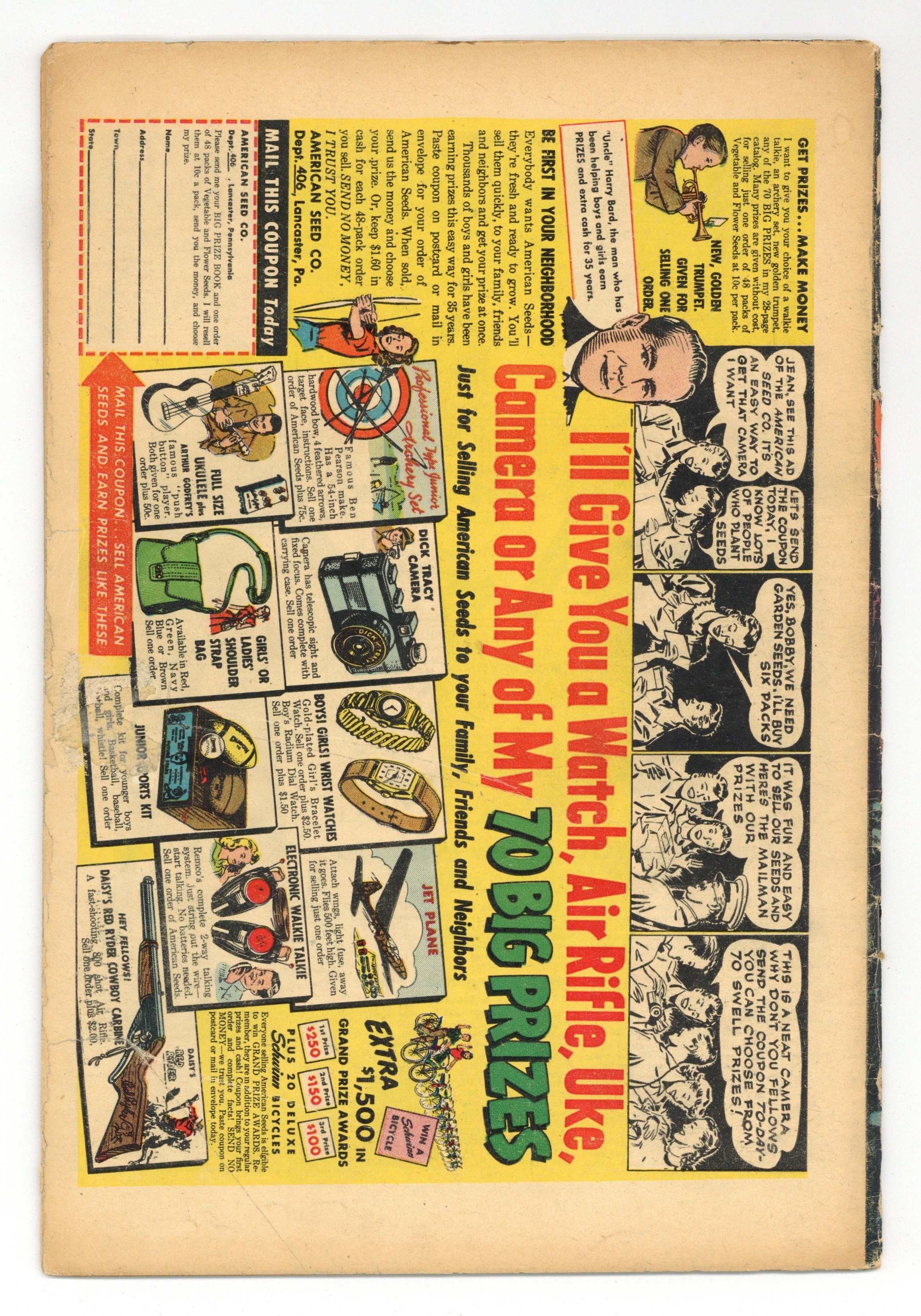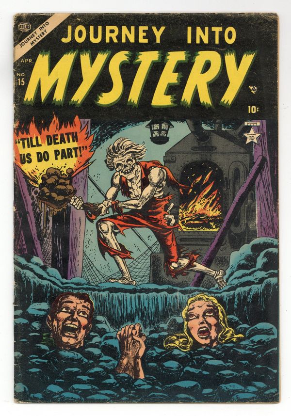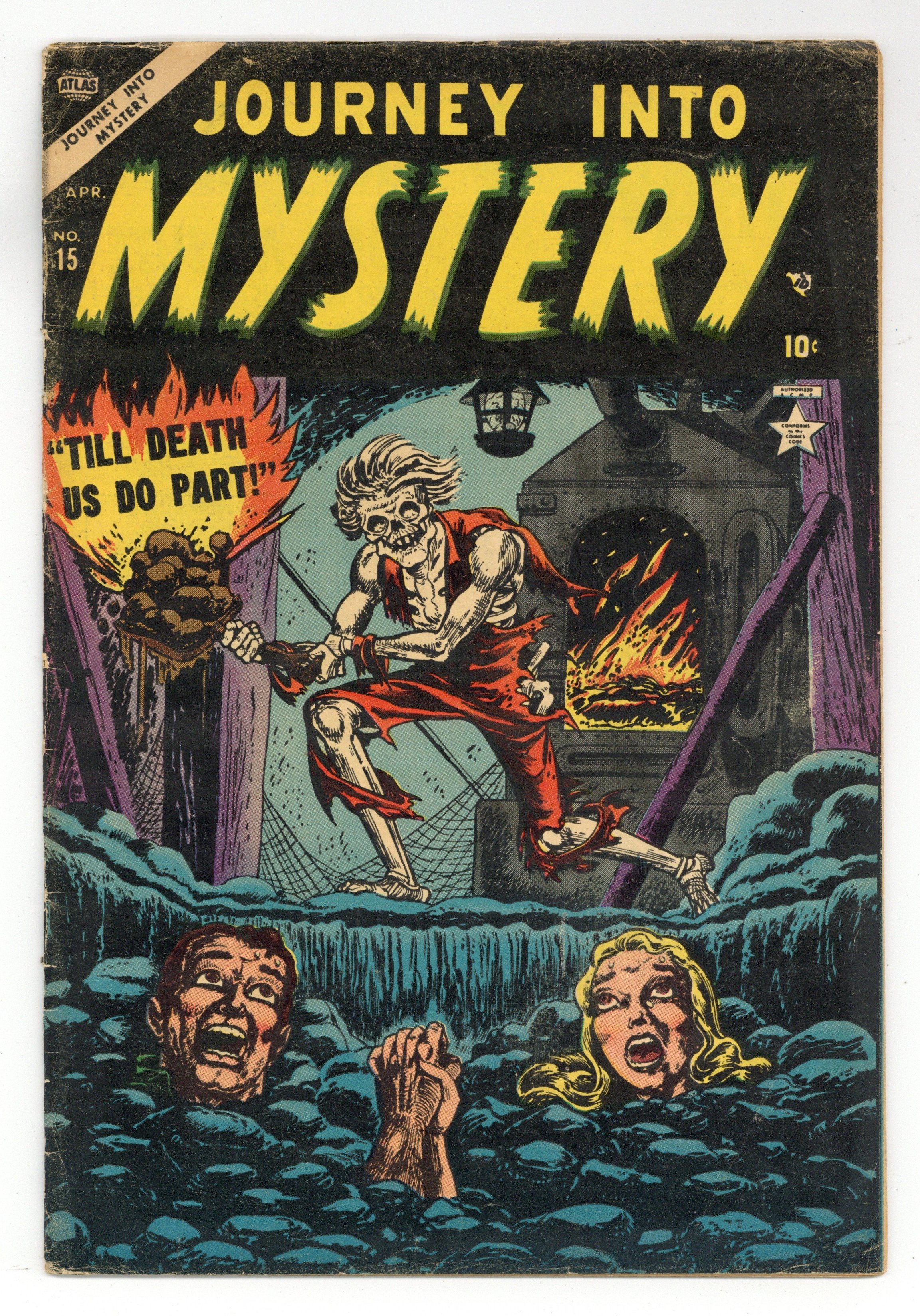 Cover pencils by Sol Brodsky. "Satan Can Wait," art by Paul Reinman; When a man enters a bar and, as a gag, offers a skeptic a contract for his soul for one million dollars, the skeptic signs it. "Killer in the House" text story. "Till Death Do Us Part," art by Vic Carrabotta; A man finally works up the nerve to strangle his cheating wife but an atomic war breaks out, and the two of them find their bodies fused together by atomic radiation. "The Face That Followed," script by Paul S. Newman, art by Al Luster; An escaped convict vows to haunt a hermit who has murdered him after ascertaining where his stolen loot was buried. "Bewitched," art by Mannie Banks; In 1686 a man asks a woman to marry him and is turned down so he plants evidence to get her condemned as a witch. "The Man Who Was Nobody," script by Paul S. Newman, art by Ed Winiarski; A Martian sleeper agent is eradicated when his usefulness is ended due to incarceration in an asylum. 36 pgs., full color. $0.10. Cover price $0.10.