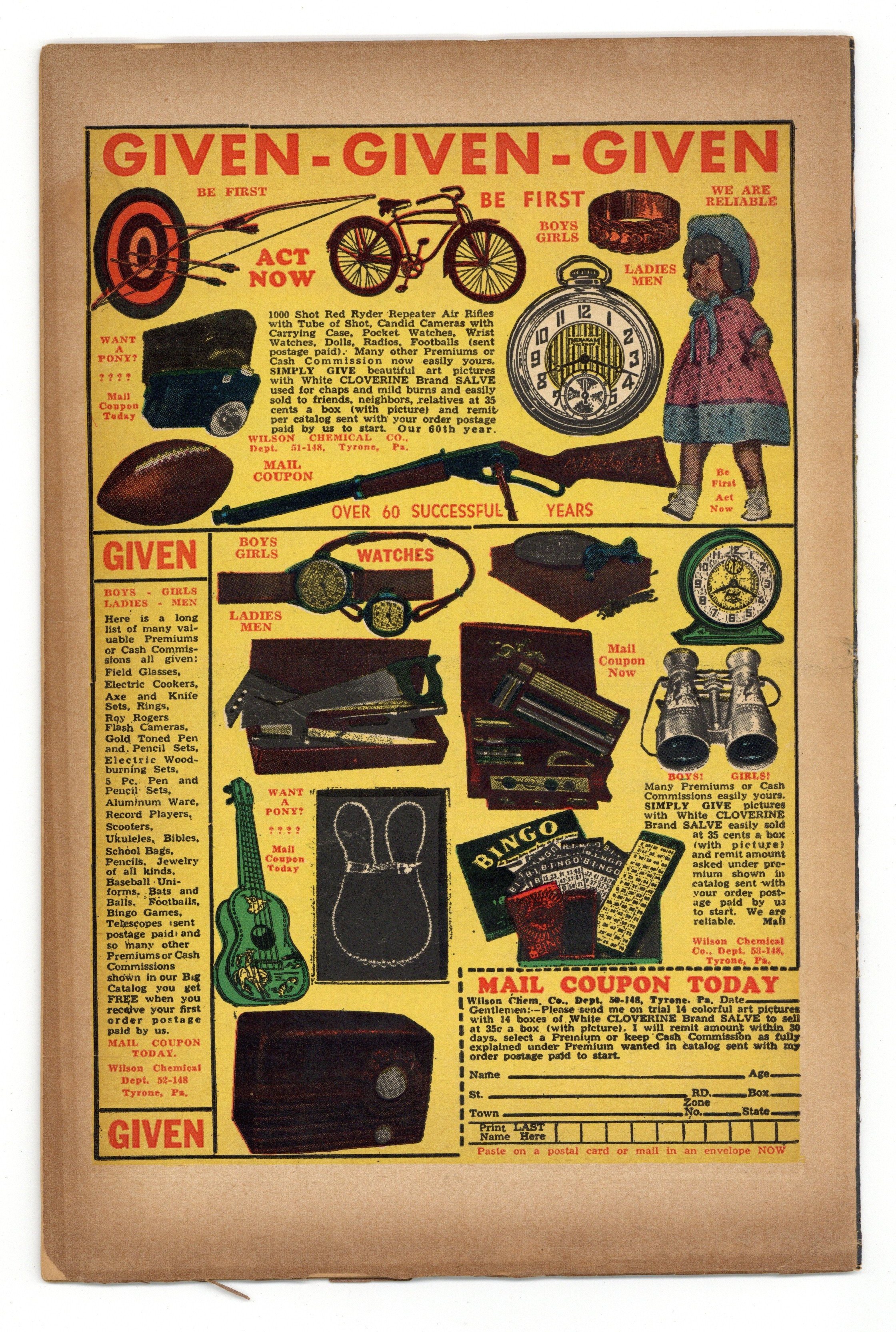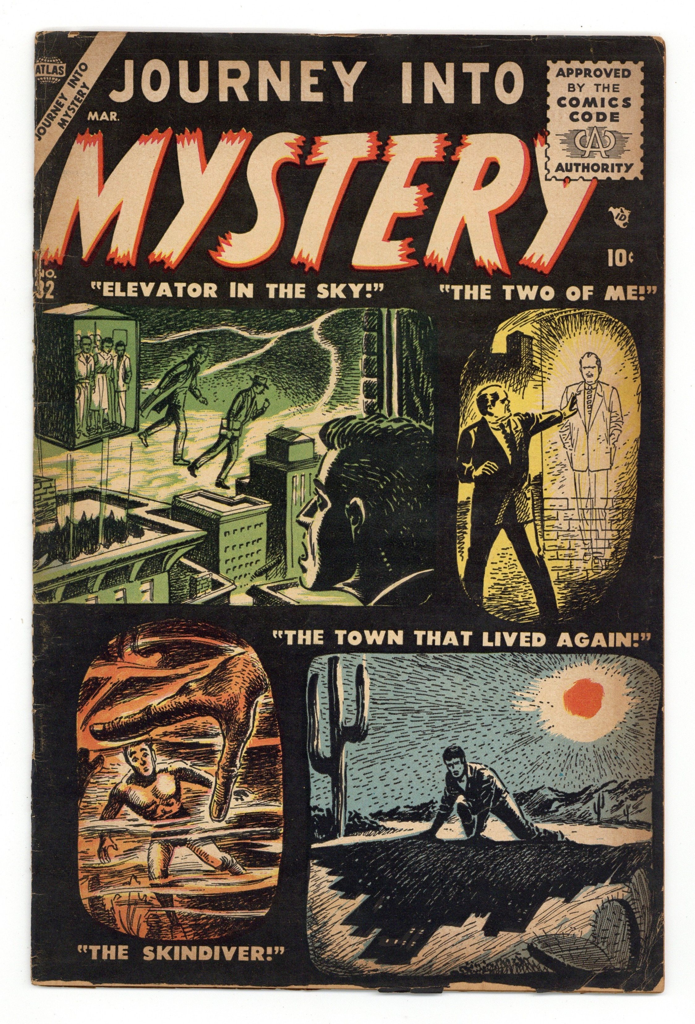 Cover art by Carl Burgos. "Elevator in the Sky!," art by Bob Powell; When a hotel magnate builds a hotel over a meteor crash site he reckons without the alien beings inside the "meteor", as it is really a spaceship, building an extra elevator in his hotel as a means back to space. "The Writer" text story. "The Two of Me!," art by Al Hartley; Parallel world doppelgangers invade. "The Skin-Diver!," art by Paul Reinman; Six divers go down, but seven come up. "Someone Out There is Calling!," art by John Forte; A freighter on Mars sends out an SOS that is received by an Earth ship. "The Town That Lived Again!," art by Joe Orlando; A man takes his friend for a visit in a miniature Alpine village. 36 pgs., full color. $0.10. Cover price $0.10.
