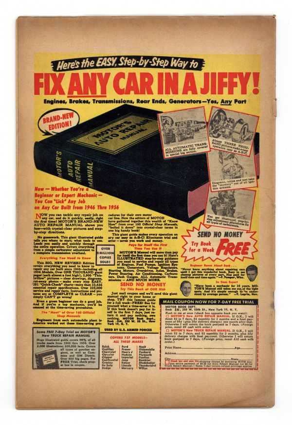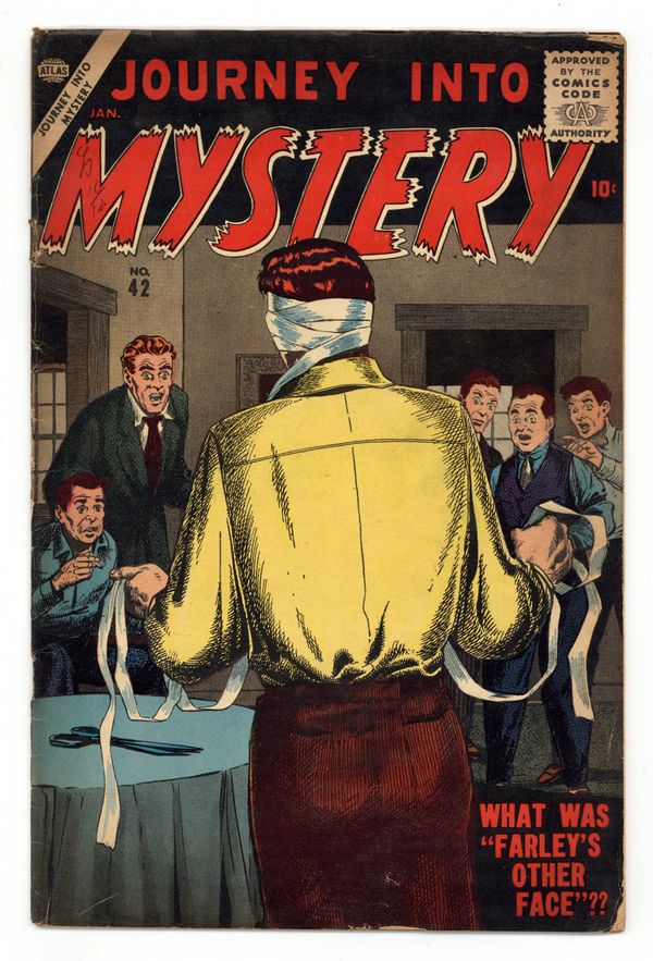 Cover by Bill Everett. "Farley's Other Face," script by Carl Wessler, art by John Forte; A man steals a thousand dollars from a recluse that he had pretended to befriend, then pays to have his looks altered and fingerprints removed to avoid trouble with the police. "Life Sentence," script by Carl Wessler, art by Robert Q. Sale; A man gives a prisoner time-traveling pills in exchange for the knowledge of where the bank roll is hidden because he knows the past can't be changed. "The Curse of Ojiir," art by Pete Morisi; When two jewel thieves attempt to steal a cursed diamond they find themselves aged prematurely. "He Saw the Future" text story. "Humans...Keep Out!," pencils by George Roussos, inks by John Giunta; Scientists are driven off the moon by lifeforms that they themselves engineered to live without oxygen so as to colonize the moon. "The Savages," art by Angelo Torres; This story postulates that the first humans were actually Martians whose spaceship developed engine trouble. "The Disappearing Man," script by Carl Wessler, art by Gray Morrow; A fight manager has his wife stolen from him when he signs up a Venusian who can disappear in the ring at will. 36 pgs., full color. $0.10. Cover price $0.10.