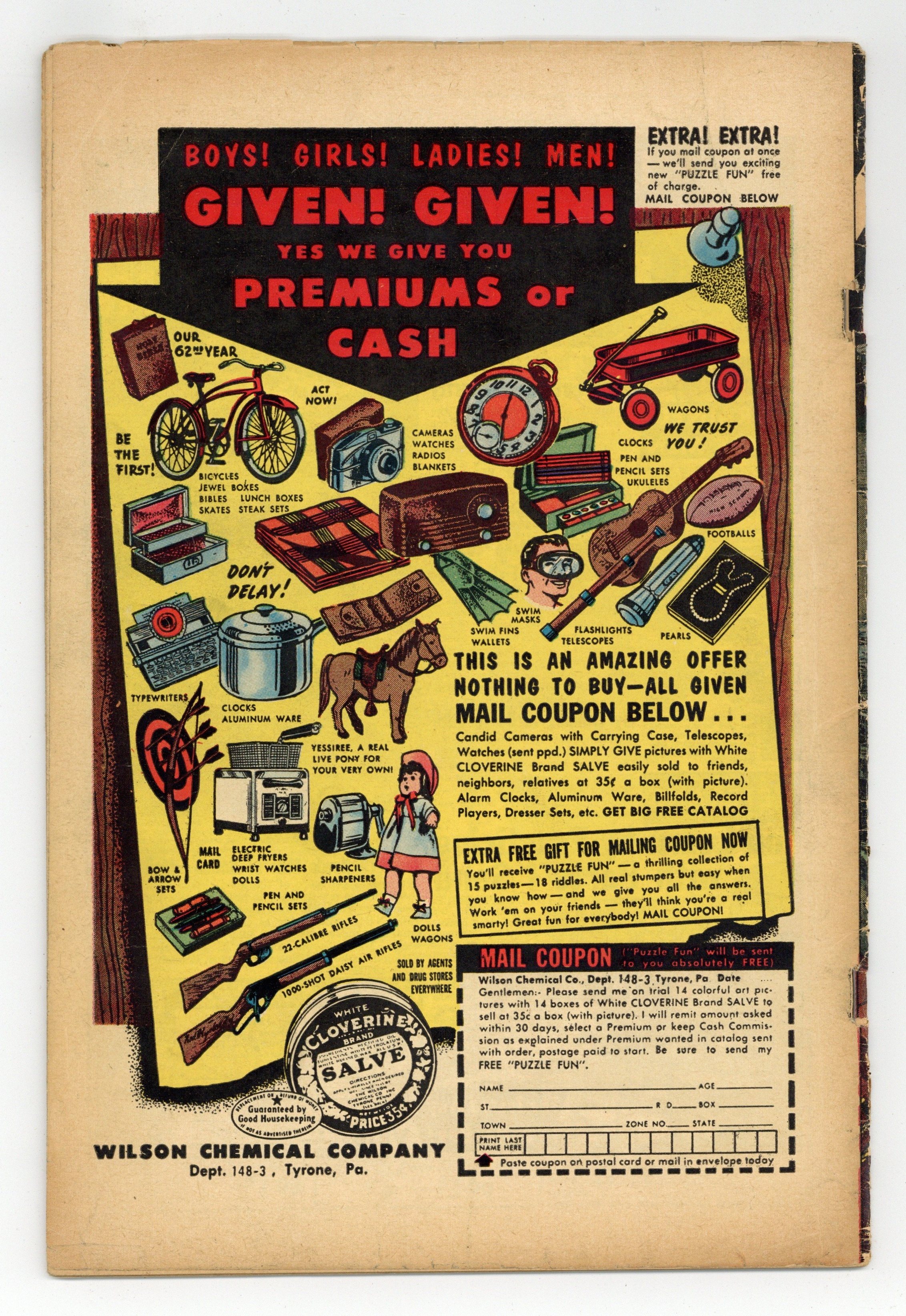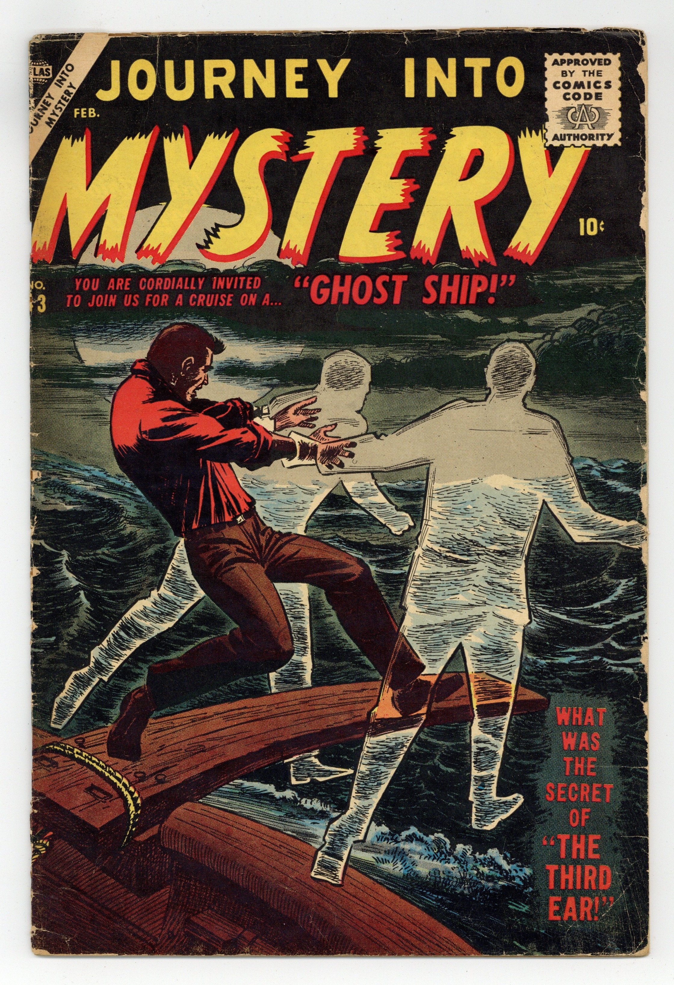Cover by Carl Burgos. "It's Waiting For Me," art by Jay Scott Pike; A man and his dog have a recurring nightmare in which some hostile presence is waiting for him just around a bend in the road; His wife dislikes the dog as its cries during the dreams disrupt her sleeping. "The Invisible Woman"; An invisible female terrorist strikes in the heart of a Communist country. "The Third Ear," script by Carl Wessler, art by John Forte; A convict with a device that lets him read minds acts as a stoolie for the prison warden. "The Secret of the Strange Stone," pencils by Al Williamson, inks by Ralph Mayo; A man finds a meteorite that gives off rays that make things disappear. "Living Portrait" text story, art by Al Williamson. "The Panhandler," script by Carl Wessler, art by Bernard Baily; A panhandler robs time-travelers from 1991 and is arrested for passing counterfeit bills. "Ghost Ship," script by Carl Wessler, art by Jim Mooney; Modern day pirates are thwarted in their efforts by a ghost ship. 36 pgs., full color. $0.10. Cover price $0.10.