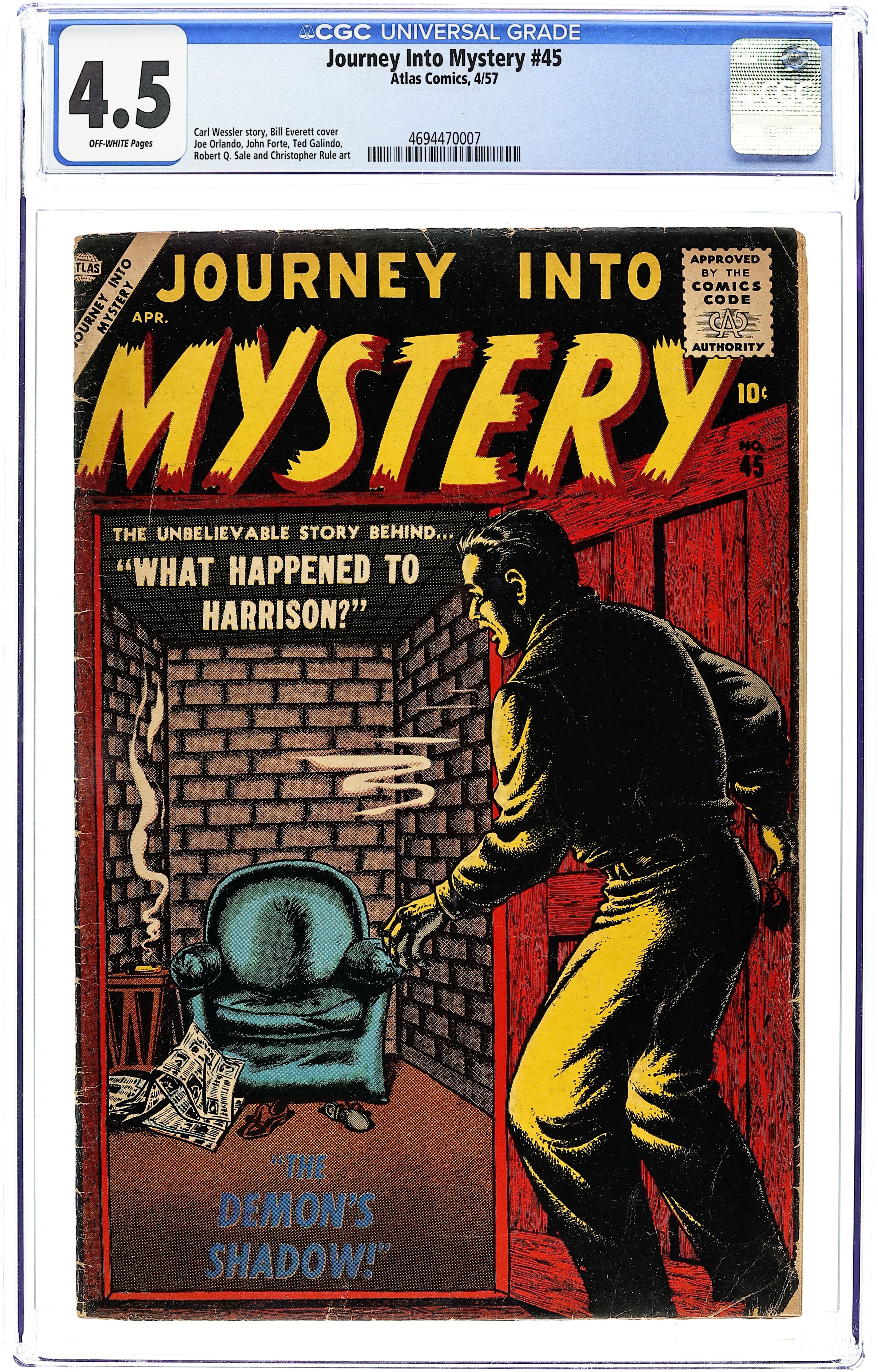 "The Demon's Shadow!" with art by Ted Galindo; "Which One of Us is Me?" with art by John Forte; "The Eye That Never Closed!" with art by Joe Orlando; "Something in the house!" with art by Robert Q. Sale; "A Scream on the Screen!"; "What Happened to Harrison!" with art by Howard O'Donnell; and a two-page text story, "Look to the Future." Cover price $0.10.