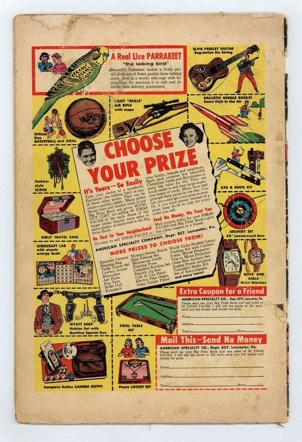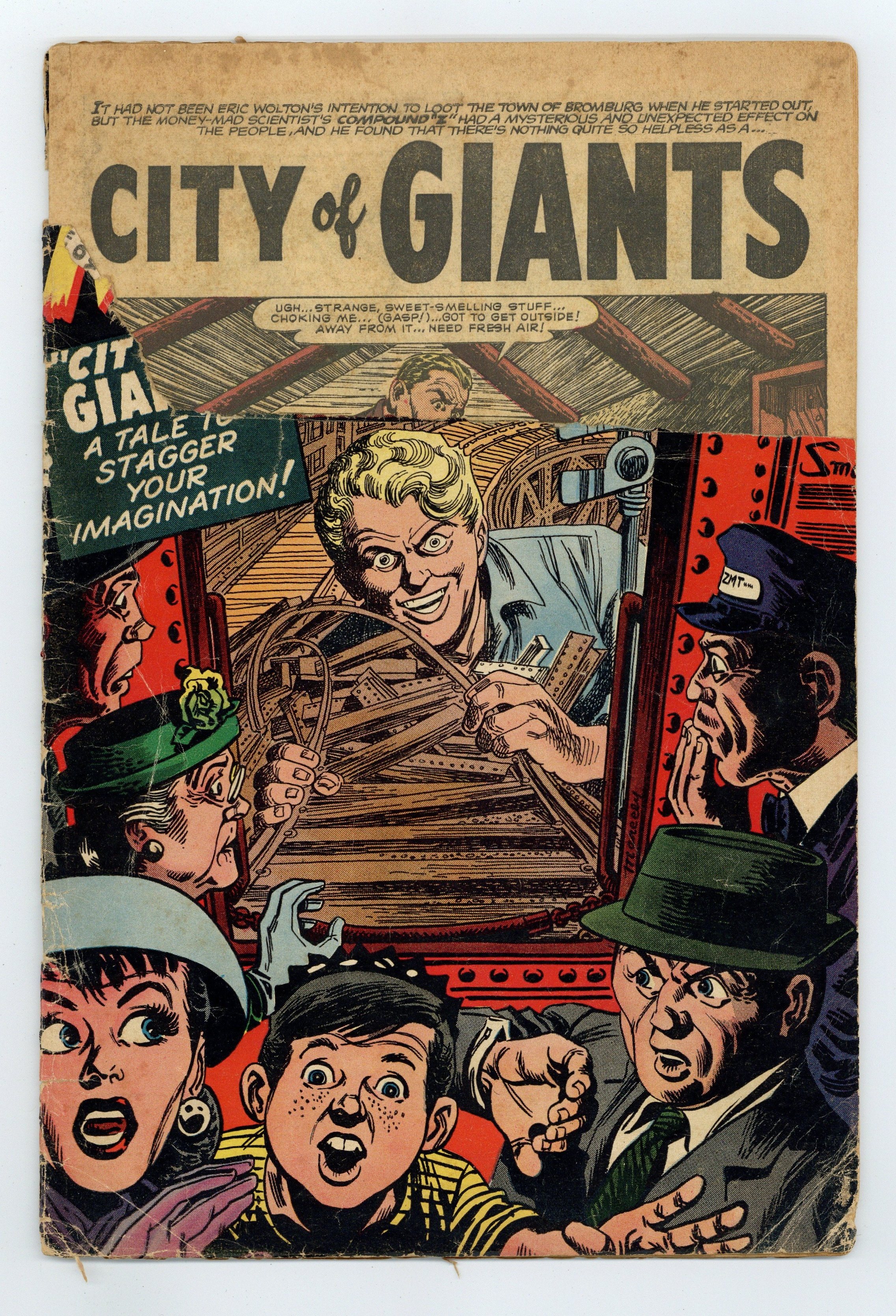 Cover by Joe Maneely. "City of Giants," art by John Forte; A man invents a gas that makes people 30 feet tall; While everyone is giant-sized, he goes around looting the town. "The Doctor Wears a Mask," art by Alfonso Greene; Sociologists investigate a totally harmonious town, and find that the people were shamed into better behavior by their persecution of a stranger who turned out to be an alien with a mirror face. "The World-Destroyers!," art by Matt Fox; Aliens make the mistake of stealing an Egyptian solar ship from the museum when they need a boat to make last minute adjustments to a bomb set to detonate in the ocean. "The Little Green Man," art by Sol Brodsky; A jade Buddha begins to possess its owner until the man even begins to resemble the fat statue. His wife frees the man by smashing the statue. "Morgan's Mad Machine!," art by Ed Winiarski; Two swindlers get taken by a conman who tries to sell them a gold-making machine. "Sdrawkcab," art by John Tartaglione; An extraordiinary child excels at sports and school, but does it all backwards. "The Room With Two Billion Cards!," art by Sidney Check. 36 pgs., full color. $0.10. Cover price $0.10.