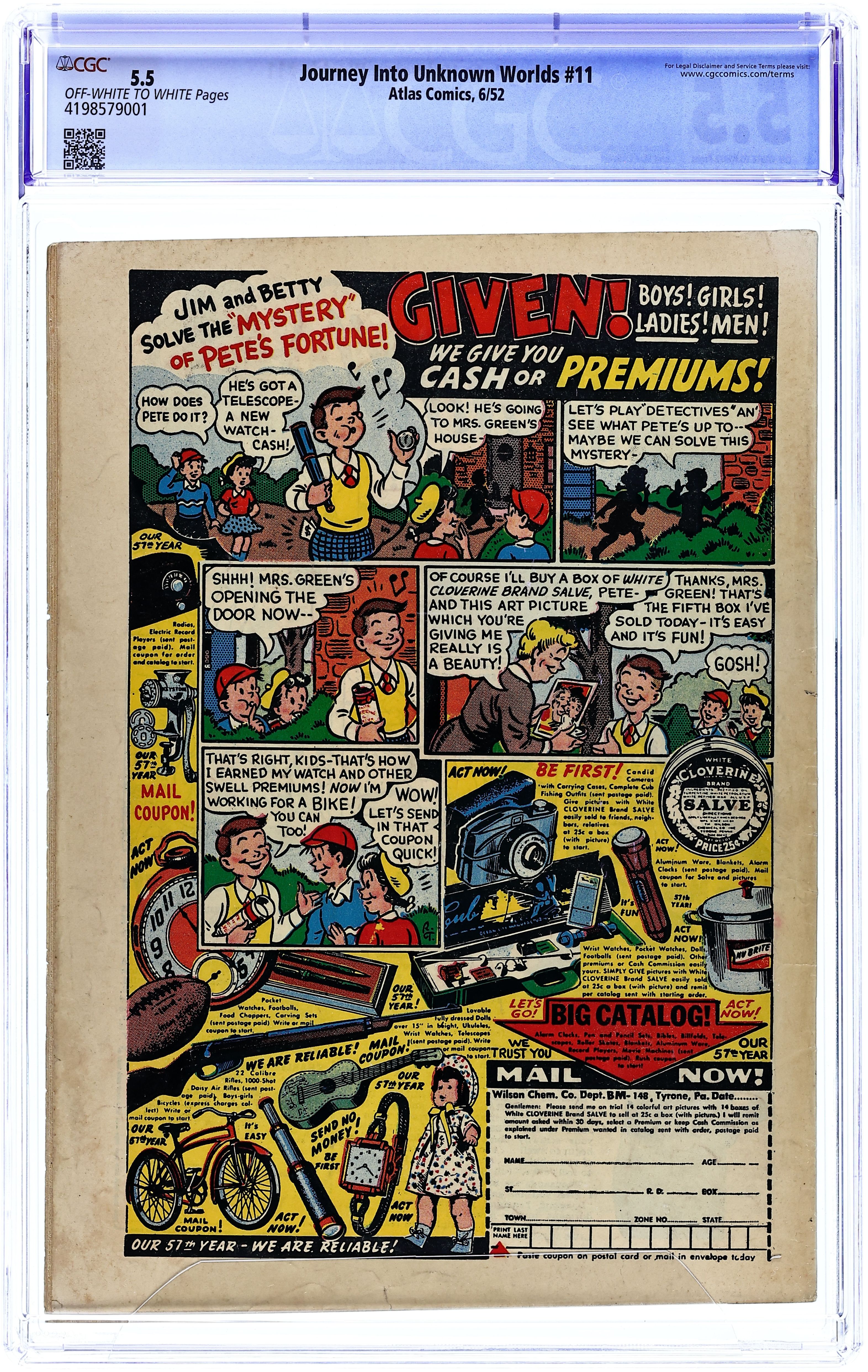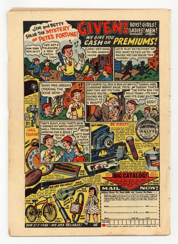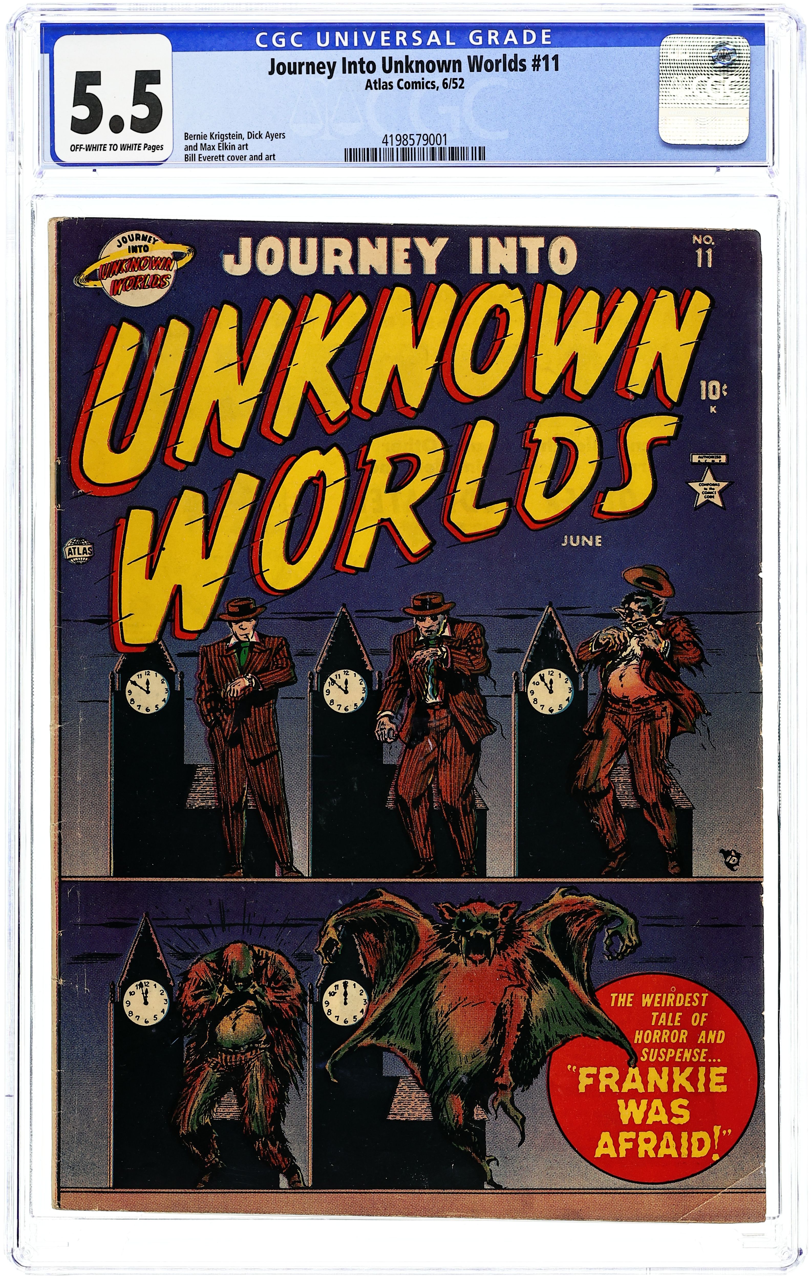 Cover by Bill Everett. Stories by unknown. Art by Bill Everett, Bernie Krigstein, Marty Elkin, Dick Ayers, George Klein and unknown. In this issue: "Frankie was Afraid!" with art by Bill Everett - Frankie is afraid of midnight and Le Doux promises to cure him, bringing him to a cemetery to prove Frankie's fears of ghosts are unfounded, but at midnight Frankie becomes a vampire and kills the doctor; 2-page text story "Endless Steps" - Steve Parker is intrigued by the shadow of a man he sees each night on his fire escape...one night he follows the man up and finds himself transported to another planet; "Kiss of Death" with art by Bernie Krigstein - In legend, Hemus had been philandering with various women until Xanthia killed him so no one else could have him...Dede is taken by Hemus' statue and is amazed when he comes to life...however, the statue of Xanthia comes to life and jealously kills Dede; "Once Upon a Corpse" with art by Marty Elkin - Monk wants to kidnap and ransom Buddy but when he grabs him, spectral energy drains the life from Monk's body, reducing him to a skeleton...Buddy was a dead child who had assumed human form; "I Can't Stop Screaming" with art by Dick Ayers - A strange man offers astounding silk cloth for Green to sell...Green sneaks into the man's house to find more of the silk but discovers the man is a human-sized spider who makes his own silk and now he's hungry; and "The Neat Trick" with inks by George Klein - Harry exposes Lokar's magic tricks...as revenge, Lokar offers to show Harry how to make his head disappear...once Harry's head is gone Lokar refuses to undo the spell. 32 pages, full color. Cover price $0.10.