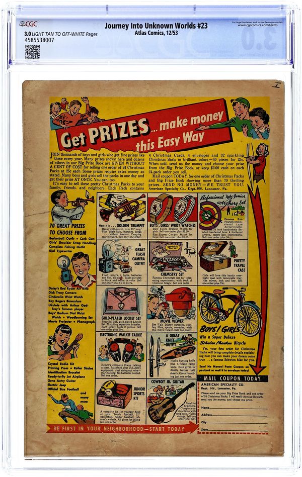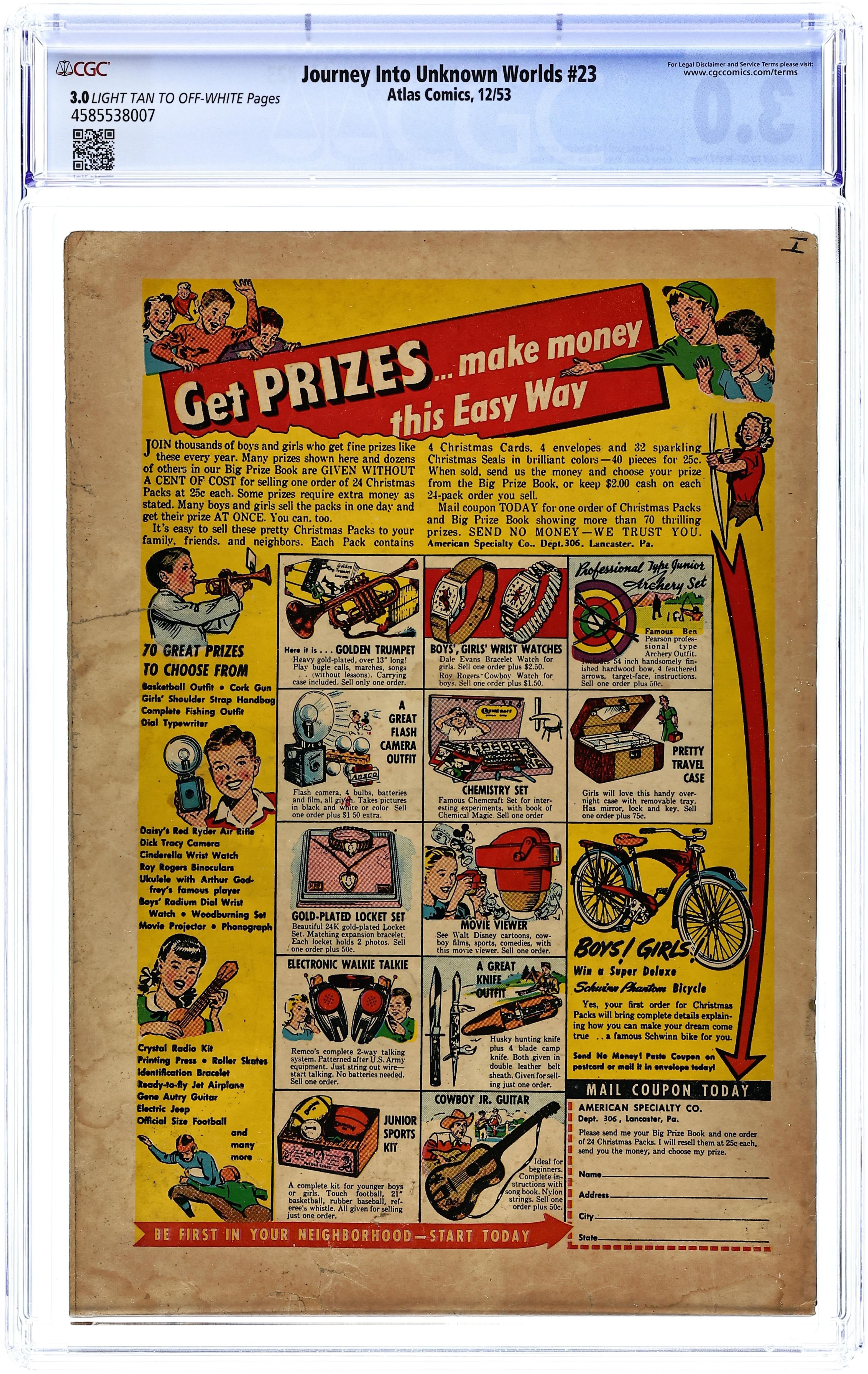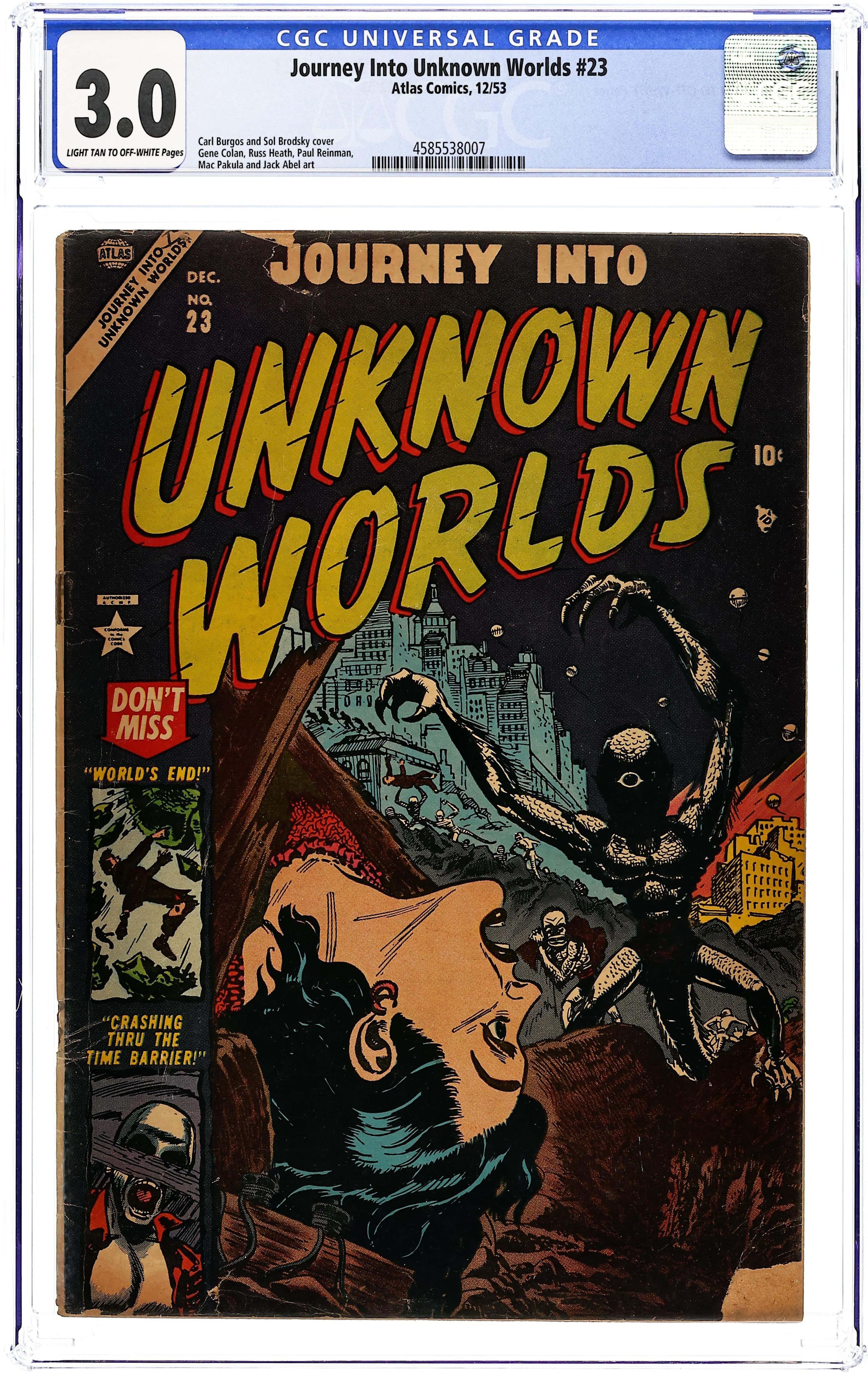 Cover pencils by Carl Burgos, inks by Sol Brodsky. The Vampire's Fangs, art by Paul Reinman; A stowaway on a freighter is bitten by a vampire bat and transforms into a bat; After draining one of the crew of his blood, he hides in a casket that is being shipped over the ocean. The First Time Machine text story. The Men from Earth, art by Mac Pakula. The World's End, art by Gene Colan; An astronomical disaster means the destruction of human civilization; Our story's protagonist is despondent over this state of affairs until he encounters a group of time travelers who are present to record the last days of humanity. Weather Balloons, art by Jack Abel. Crashing Through the Time Barrier, art by Russ Heath. 36 pgs. $0.10. Cover price $0.10.