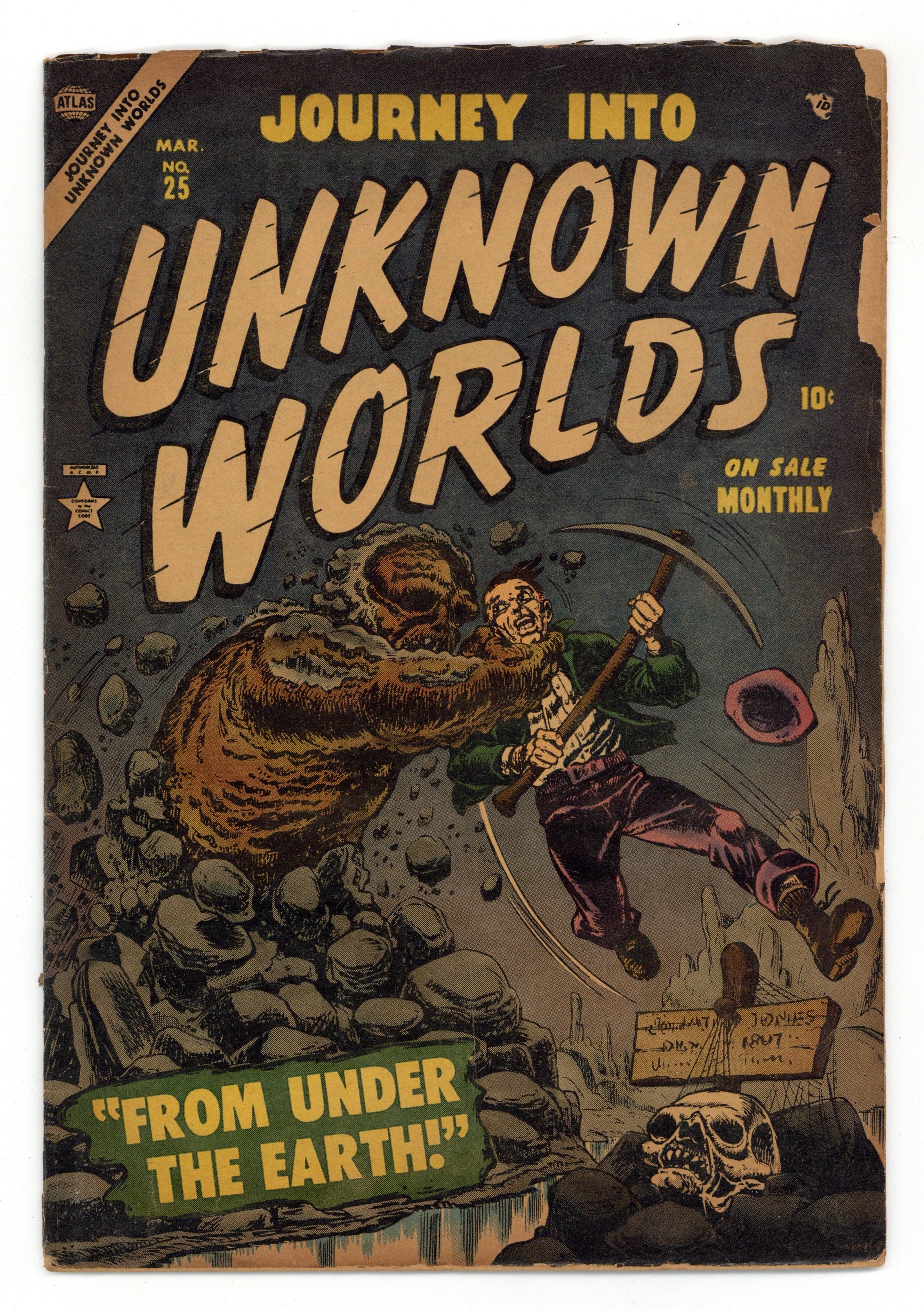 Cover pencils by Carl Burgos, inks by Sol Brodsky. The Castle of Shadows!, art by Doug Wildey; When a man returns to the family castle, he finds that stories among the locals of him inheriting the curse of lycanthropy are true. The Headhunters text story. When Death Comes A-Calling; When a truck strikes a small boy and kills him, Death grants him a reprieve. The World Within, art by Robert Q. Sale; A man whose face is scarred by Nazi torturers escapes to an underground world where he is accepted by the blind people who live there. One Extra Head, art by Dan Loprino; When a carnival owner finds a woman with two heads to join the man with two heads on stage, the two-headed man finds his response to her is disgust, just the same as everyone else. From Under the Earth!, art by Chuck Winter. 36 pgs. $0.10. Cover price $0.10.