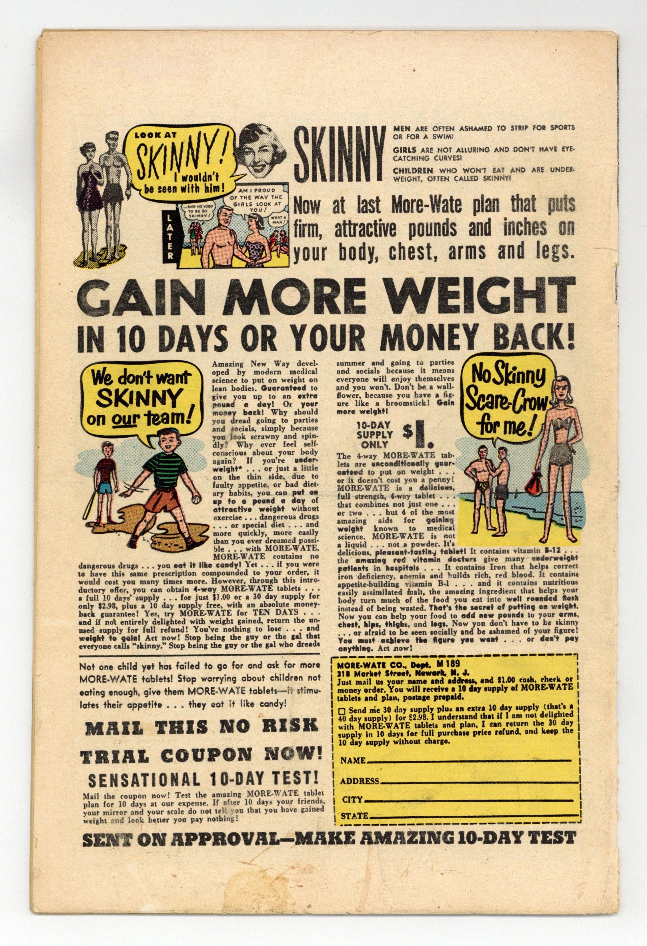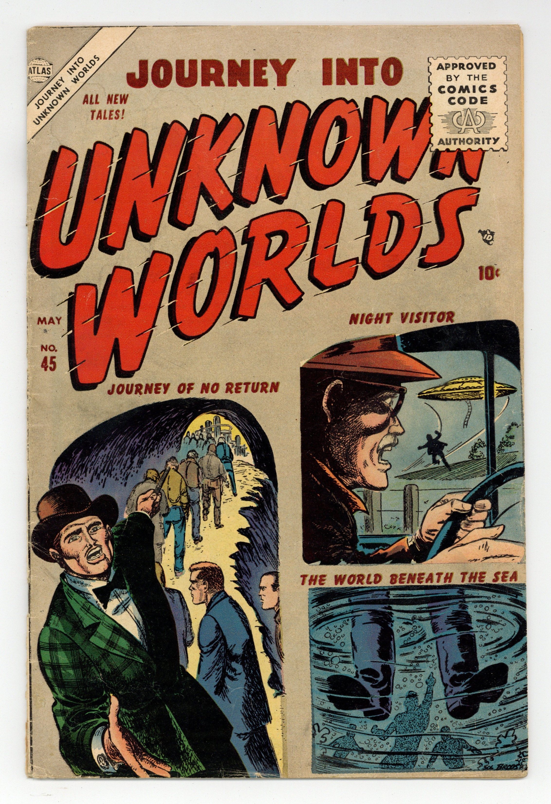 Cover art by Sol Brodsky. The Night Visitor, art by Steve Ditko; A man investigates a flying saucer and bumps his head inside; When he comes to, he finds that he can't interest anyone in authority about the various flying saucers he sees, and he learns that while he was unconscious he was transported to Jupiter. The World Beneath the Sea, art by Al Williamson; A skin diver finds a race of people living beneath the sea. Journey of No Return, art by Bob McCarty; An attendant of a carnival is surprised to learn that the Ferris wheel is a method for returning alien visitors back to their homes. The Derelict in Space, art by Ed Winiarski; Space explorers find a deserted satellite in space with a diary entry about aliens offering to take the crew away to paradise. The Comic text story. And Never Come Back, art by George Roussos. Man Against the Moon, art by John Forte. 36 pgs. $0.10. Cover price $0.10.