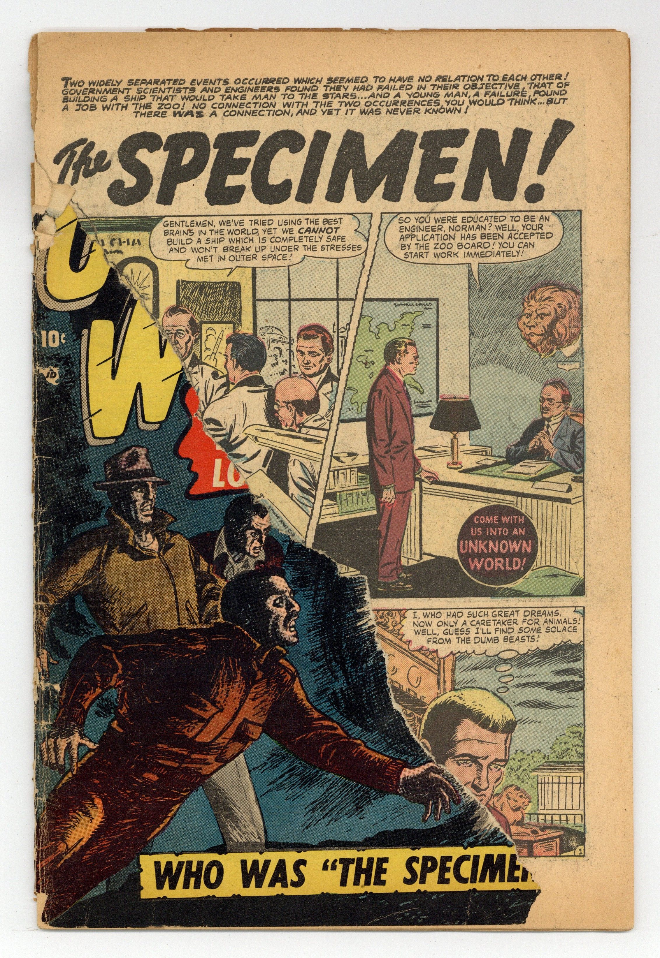Cover art by Carl Burgos. "The Specimen!", art by Jim Mooney; A zookeeper who had hoped to be an engineer is disconcerted by an ape-like specimen with wide staring eyes which turns out to be an alien; The alien transfers the knowledge of how to build spacecraft to the zookeeper so that he can show other engineers how to visit alien planets. "Three Were Lost!", art by Vic Carrabotta; Three brothers test fly an experimental jet which travels so fast it breaks the time barrier; The leader of the future asks them not to tell of what they have seen and they return to their own time. "If Worlds Collide," script by Carl Wessler, art by John Forte; Earth leaves its orbit and heads towards Mars, getting colder; A scientist builds a giant magneto in order to restore the planet's orbit. "Rain from Nowhere!", script by Carl Wessler, pencils by Bob Bean; A cargo plane enters a strange cloudburst and when it exits the heavy rain the crew find themselves in a unknown village; They fix the pumps to drain away water from heavy rain and fly back out the way they entered. "The Experiment" text story. "Falling Star!", art by Kurt Schaffenberger; A confused alien who thinks that he is returning home is dropped off by accident on Earth; He sends a signal and his comrades pick him up. "The Giants," pencils by Bob Forgione, inks by Jack Abel; A space explorer decides he's had enough after he encounters giant space aliens. 36 pgs., full color. Cover price $0.10.