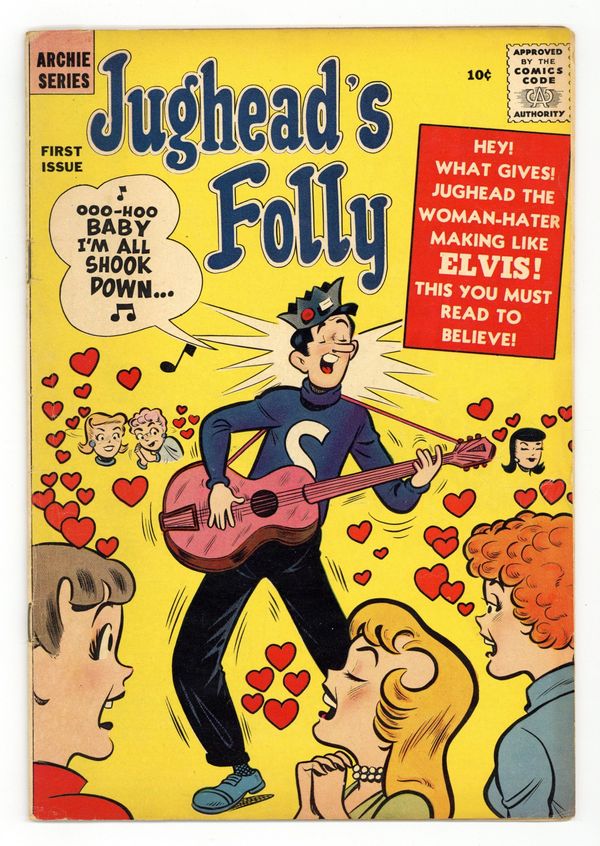 Possibly the 1st reference to Elvis Presly in comic books, according to Overstreet. Chapter #1 "Nobody!"; Jughead approaches Veronica because she is having a party and hasn't invited him. She and Betty call him a "Nobody"; Then he insults Big Moose accidentally, but Moose doesn't think he is worth hitting because he is a "nobody." Chapter 2 "Opportunity Knocks!"; He returns to the Chok'Lit Shop a little while later to drown his sorrows in a hamburger and is turned away by Pop Tate because he has no money; He goes to the juke box to sing with his favorite record, "Blue For You." Chapter #3 "Going Up!"; He gets on "Redfree's Talent Show" and wows the crowd by making them cry with his heartfelt voice. Chapter #4 "The Celebrity"; He becomes a huge star but has no freedom; All he wants is a hamburger, but his manager keeps him so busy he can't get any burgers. Chapter #5 "From Top To Bottom!"; He decides he can't handle stardown, so he destroys his career and gets fired by his manager. 36 pgs. Cover price $0.10.