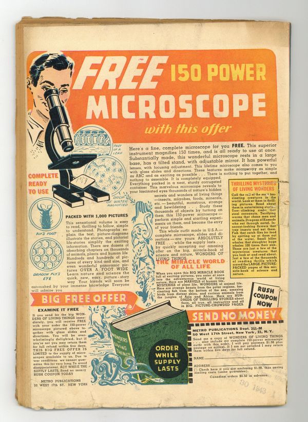 Published Oct 1943 by Fiction House.$283.00- Cover and interior wraps detached at single center staple. Cover and interior oxidation. Water damage. Interior tearing.