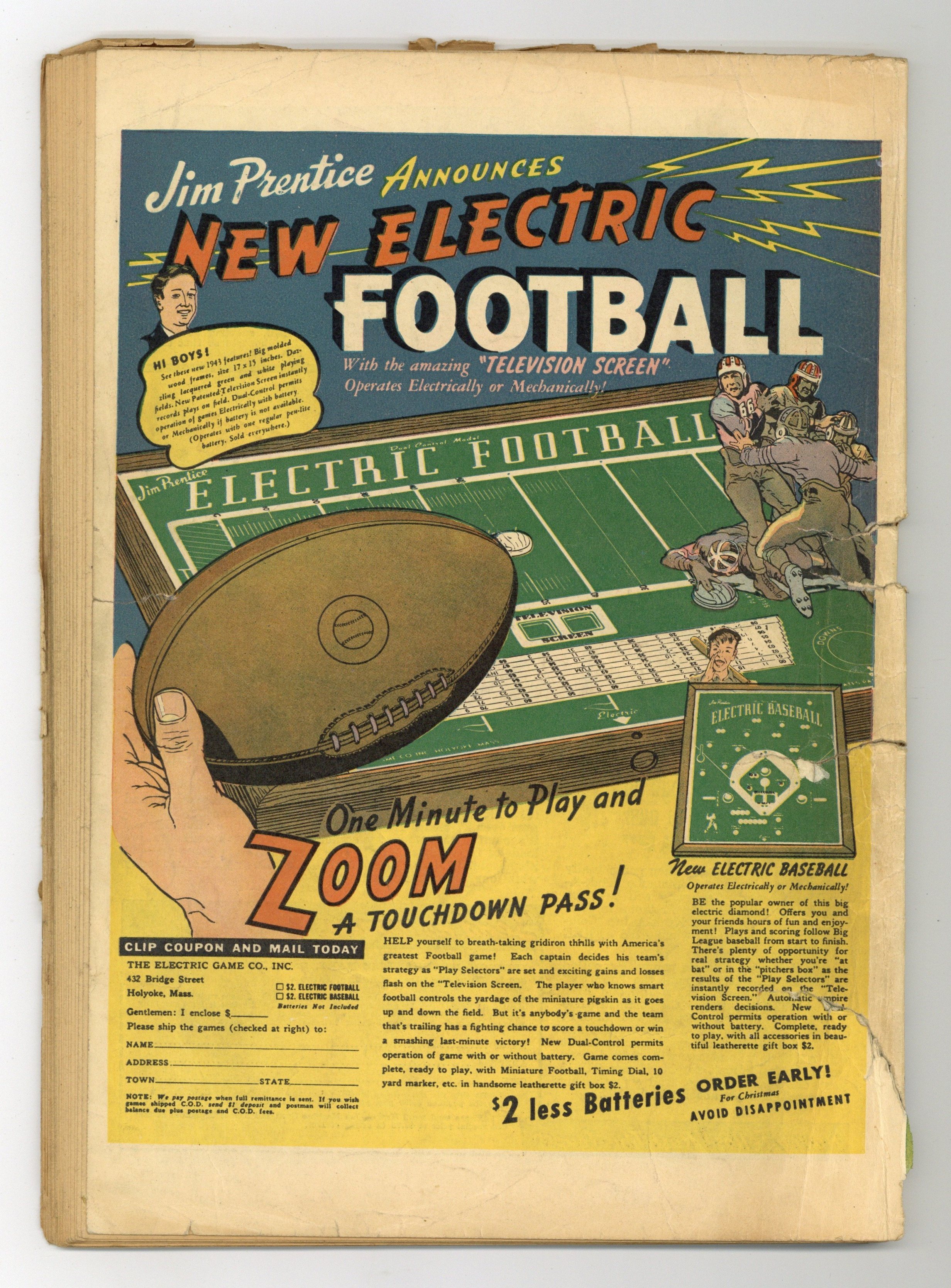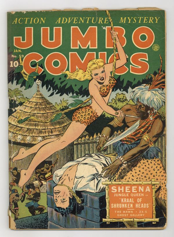 Cover by Art Saaf. Edited by Jerry Iger. Stories and art by Alex Blum, Nina Albright, Arnold Hicks, and Robert Webb. An influential anthology starring jungle hero Sheena, featuring early art by legendary comics artists in the Eisner-Iger Shop. A tribal cult seeks Bob and Sheena for human sacrifice, interrupting Sheena's bath in a river; Buccaneer The Hawk meets a female aviator who takes him on an adventure in a primitive 17th century hot-air balloon; A beautiful Filipino spy aids Agent ZX-5 on a dangerous island mission. Action-packed Sheena cover by Art Saaf has her rescuing a bound Bob once again. The Hawk; Weird Stories of the Supernatural; Sheena, Queen of the Jungle; Ghost Gallery; Midnight the Black Stallion; Speaking of Africa...; ZX-5 Spies In Action; Inspector Dayton. 56 pages, Full Color. Cover price $0.10.