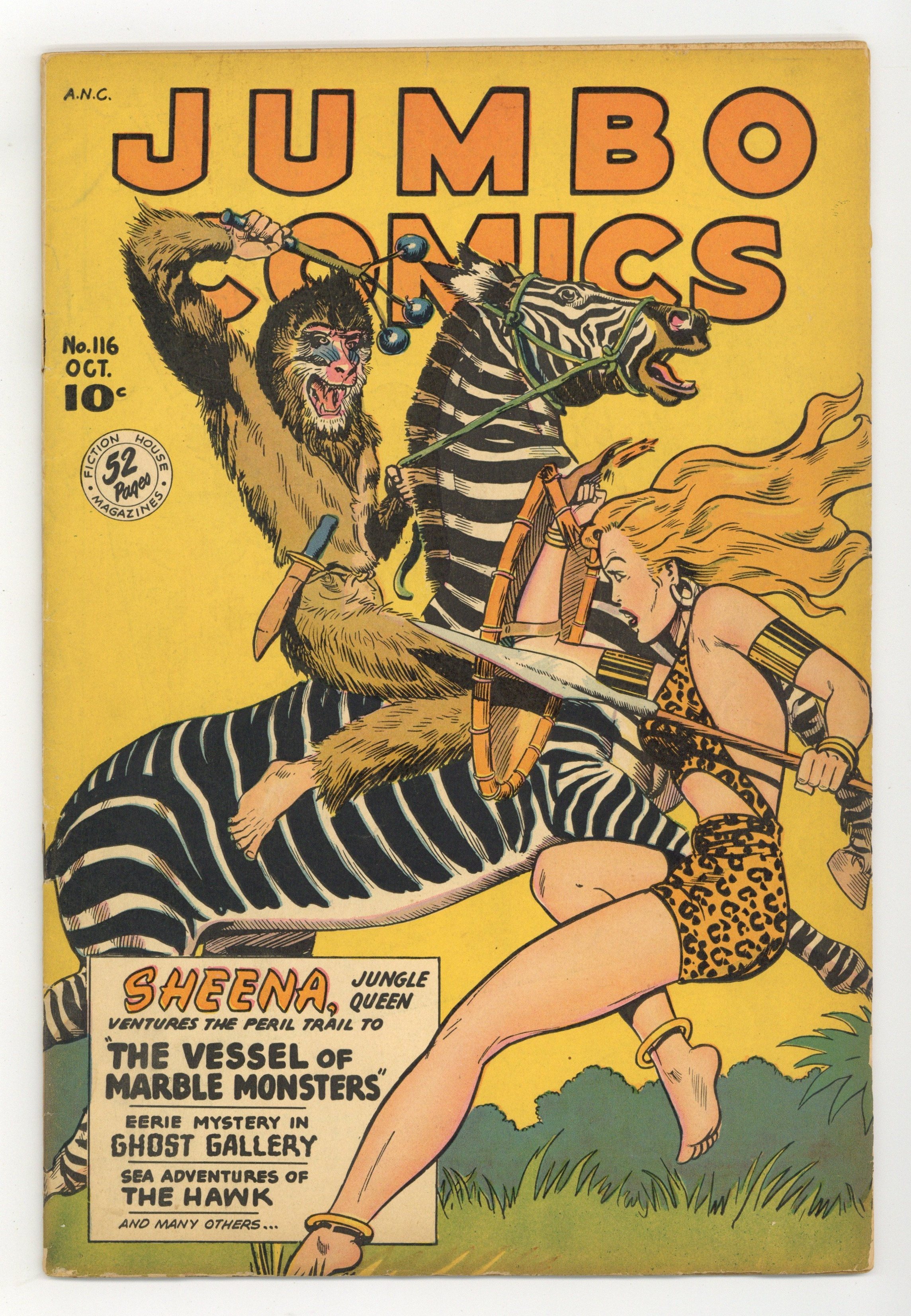In order of appearance: "Sheena, Queen of the Jungle" art by Robert Webb; "The Ghost Gallery" art by Jack Kamen; "Sky Girl" art by Matt Baker; "Stuart Taylor in Weird Stories of the Supernatural" and "ZX-5" art by Jack Kamen; and "The Hawk" art by Robert Webb. "Friend in Need" text story. 52 pages. Full color. Cover price $0.10.