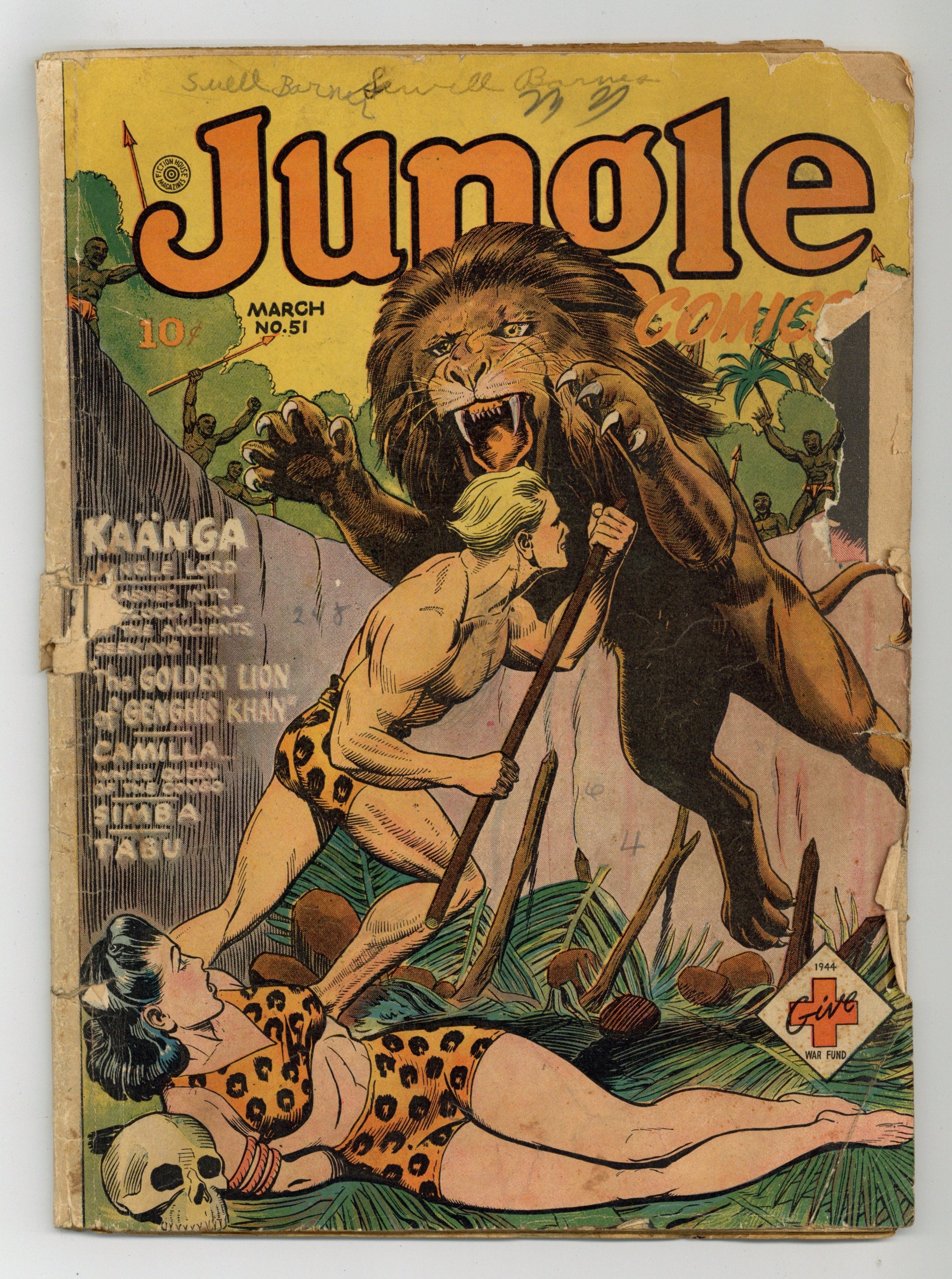 Cover art by Joe Doolin. "The Golden Lion of Genghis Khan," art by Jim Mooney; Seeking radium for medical purposes, Gordon enters the Khafu country with Kaänga, Ann, and N'geeso; The queen of the Khafus captures Ann and plans to kill her by exposing her to radium, but Kaänga comes to Ann's rescue and the queen suffers the fate she had planned for Ann. Untitled story; During a native lion hunt, Simba's cub is killed; In the village, the old chief dies and the witch doctor Dwando assumes his place. Cover pencils by Ruben Moreira; Tabu comes across a conquistador who has been drinking from a fountain of youth for hundreds of years; However, he is overdue for a drink so he and Tabu hurry through the jungle and barely make it in time to save the Don's life. Untitled story, art by Henry Kiefer; A brain-damaged British flyer kidnaps the daughter of scientists who are visiting Wambi's jungle to collect snake venom; Wambi and his jungle friends rescue the girl and the scientists agree to treat the flyer. "Elephant Code" text story. Untitled story, art by George Appel; An old friend of Fantomah's father leads her to a treasure cached by her father in her youth. Untitled story, art by Richard Case; Ben Aouli kidnaps the sheik's daughter and Terry and Andy ride to her rescue. "The Golden Death," art by George Tuska; The B'jutis' witch doctor gives tribal treasures to white treasure hunters and blames the boy, N'gat; Camilla captures the thieves and clears N'gat's name. 60 pgs., full color. Cover price $0.10.