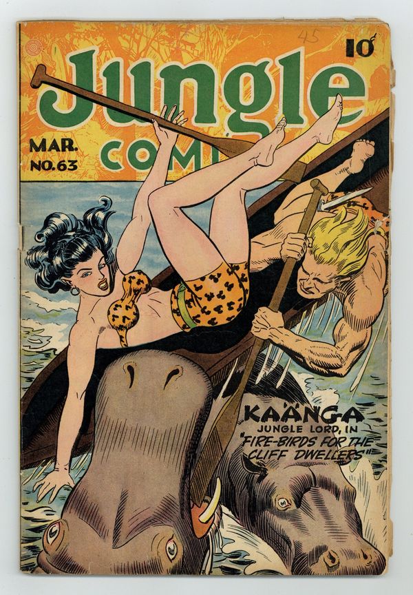 Cover art by Joe Doolin. "Fire-Birds for the Cliff-Dwellers," art by Ruben Moreira; Kaänga's arbitration of a dispute over an idol is not received well by the cliff people who steal the idol; They plan on sacrificing Ann to the idol; Kaänga and Dorna, a cliff people girl that he once saved, prepare fireworks that frighten the cliff people, allowing Kaänga to rescue Ann and retrieve the idol for the valley people. "The Serpent Prophecy," pencils by Robert Webb, inks by Matt Baker; After the death of Haj Abdu, Ko comes to believe that Wambi is the rightful heir to the village throne; He plots to kill Wambi on a lion hunt but Wambi is saved by the intervention of his jungle friends. Untitled story, art by Richard Case; Simba tricks his latest rival, Chonga the Cape buffalo, into falling into a tiger trap dug to capture Simba. Untitled story, art by Howard Larsen; An old hermit casts spells that shrink men and animals to a tiny size for his own amusement; Tabu restores the animals to their original size and they kill the hermit. "Who Leads the Pack May Be Its Prey" text story. Untitled story, art by Richard Case; Terry arranges to settle a land dispute by having the leaders race camels to decide who gets the lands. Untitled story, art by George Tuska; A group of bandits raids caravans in order to get slaves to build their fortress; Camilla manages to free the slaves and acquires a pet dog. 52 pgs., full color. Cover price $0.10.