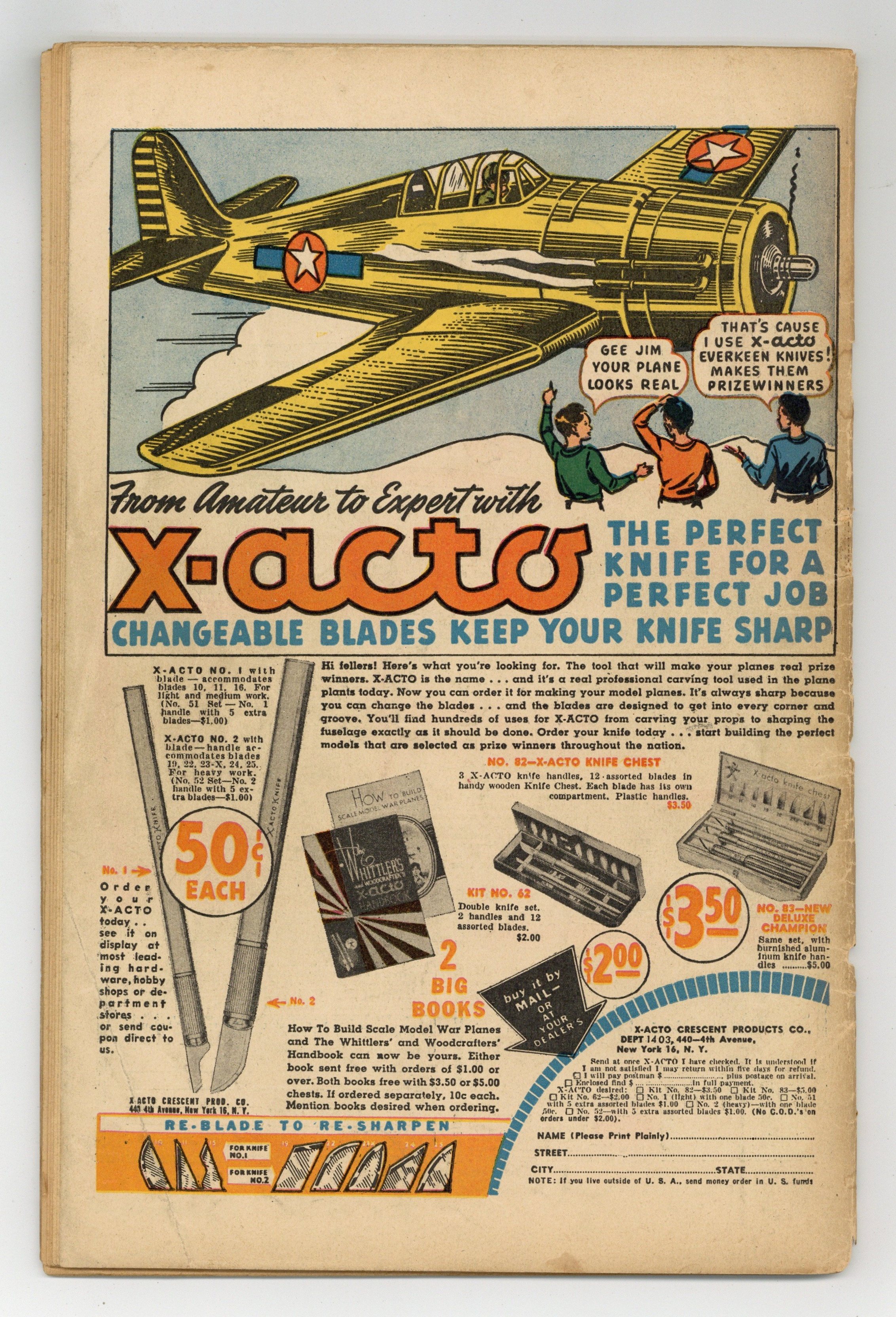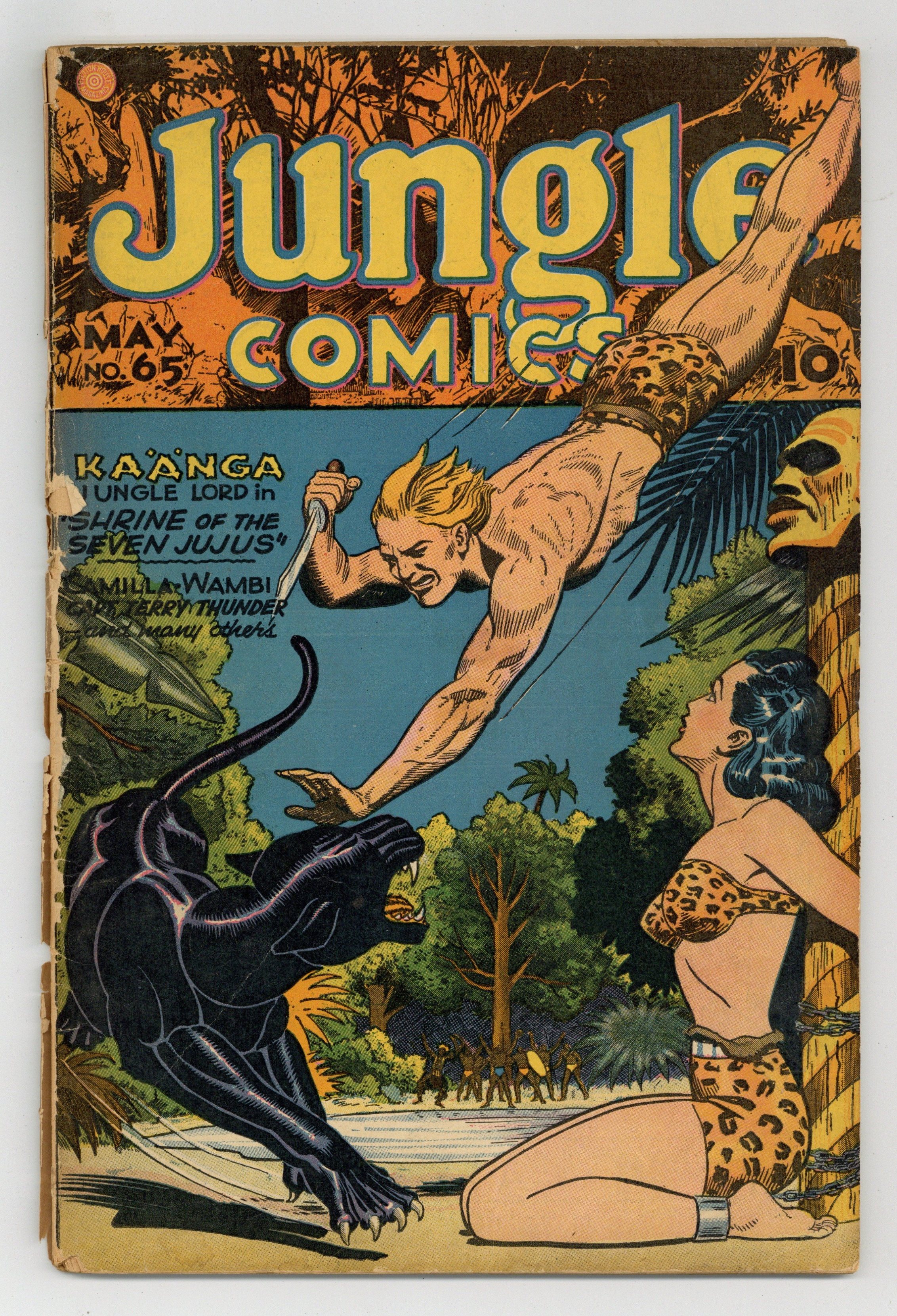 Cover art by Joe Doolin. "The Valley of the Seven Idols!", art by Ruben Moreira (as Rubi Moore); A hunter, follower of a blood cult, comes to the jungle and takes a fancy to Ann; When he kidnaps her, KaƤnga attacks, liberating Ann, and killed the hunter. Untitled story, pencils by Robert Webb; Wambi prevents the sacrifice of a young woman by the Scorpion Killers and sees to it that their priest is himself killed by a scorpion. Untitled story, art by Richard Case; A group of bandits hope to lure Terry and the lancers into a trap, but Terry is ready for them and turns the tables. Untitled story, art by Howard Larsen; Tabu has a magic duel with Mubo the witch doctor, who is forcing his own people into slavery as diamond miners. "Leave Me Alone!" text story. Untitled story, art by Richard Case; A giraffe saves one of Simba's cubs from a snake, and, later, Simba returns the favor by saving the giraffe from native hunters. Untitled story, pencils by George Tuska; Camilla frees slaves and mis-treated elephants from a lumber camp. 52 pgs., full color. Cover price $0.10.