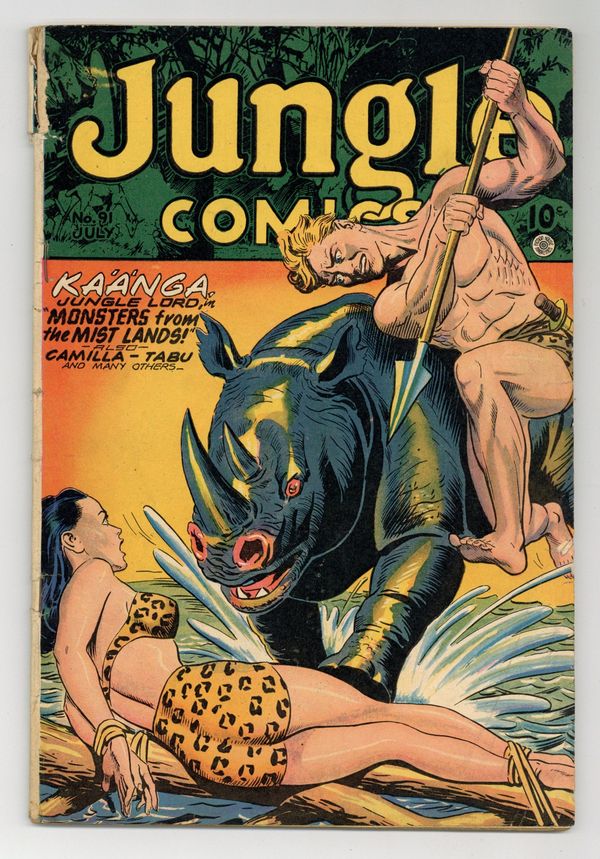 Cover art by Joe Doolin. "Monsters from the Mist Lands!", art by John Celardo; A schemer from Princess Valla's city comes to Kaänga's jungle and takes the princess's bracelet from Kaänga. Kaänga, Ann, and N'geeso pursue the thief back to the city, where Ann is taken captive; The schemer, Kasna, demands that Valla follow the law and wed the holder of the bracelet; if she refuses, he will kill Ann. Untitled story, art by August Froehlich; Simba journeys to a new land where he is challenged by that country's lion-king, Zingara; Simba defeats Zingara but is then attacked by a tribe of apes, believing that he is Zingara, whom they hate. The Kavirondo, art by Mike Peppe; A brief description of a tribe living on the eastern shore of Lake Victoria. Untitled story, art by Charles Sultan; Escorting a government official and his daughter on a hunt for a white giraffe, Terry and the hunters are taken captive by a white priestess and her tribe; Keeto arrives in time to save the party from death by leopard. "Dead Man's Revenge" text story. "Shirkah!"; Prince Kopur comes to Wambi's jungle to capture animals; He captures Wambi, as well, when Wambi attempts to free the captives; When Kopur elects to torture Wambi, he makes his escape and sets a fire that allows the captive animals to escape. Untitled story, art by Howard Larsen; Tabu interferes in a magician's effort to extract payment from the N'ganzos for the return of their princess from the grip of the god of the mists. Untitled story, art by Fran Hopper; Priestess Senga plots to have her personal assassin, K'bali, exonerated of his crimes at a public trial; Camilla thwarts her plans and Senga and K'bali are both killed by leopards. 52 pgs., full color. Cover price $0.10.