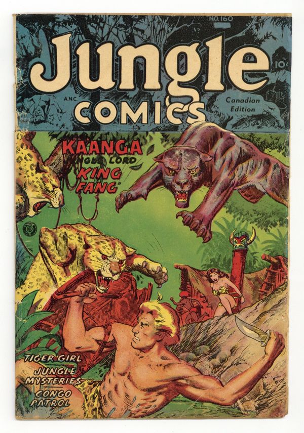 "King Fang"; Kaänga's ape friend, Koonda is taken captive by hunters; Kaänga frees him and follows him back to his band where Koodna must fight to re-establish himself as king. "The Bone Bender" Jungle Mysteries story; A man is determined to watch a secret medical treatment and pays a high price. "The Courage of Kaambi" text story by John Lindstrom. Untitled Jungle Patrol story, art by Ruben Moreira; Kip and Shadow help free Marcia from her kidnappers. Untitled Jungle Tales story; Jim gives a brief natural history of the crocodile. Untitled story, art by Maurice Whitman; Tiger Girl exposes the forbidden Bakete Society and frees a young woman accused of witchcraft. 36 pgs., full color. Cover price $0.10.