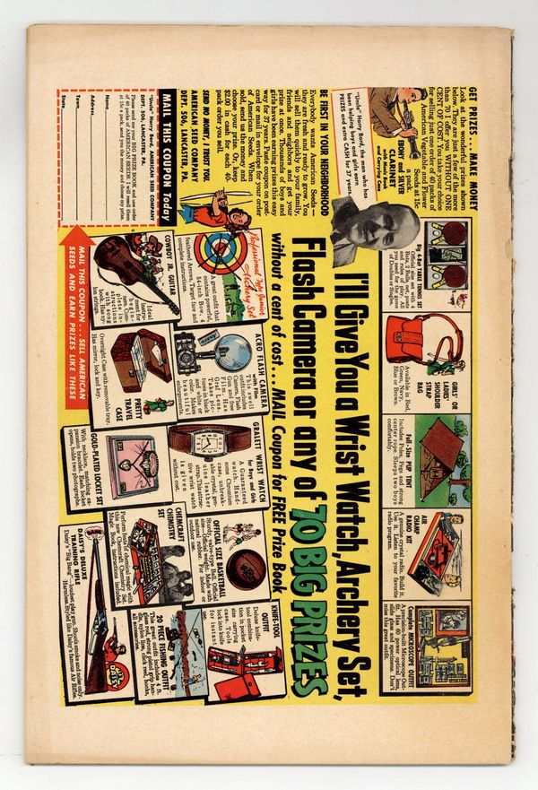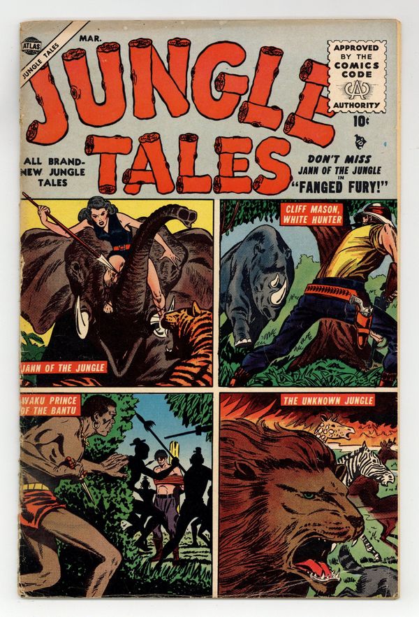 Cover pencils by Syd Shores. "Fanged Fury!", script by Don Rico, art by Jay Scott Pike; Jann adopts a lion cub that she believes has been orphaned. "Jungle War!", script by Don Rico, art by Fred Kida; Waku refuses to lead his men into war against Rakatu but is willing to challenge Rakatu to single combat to the death. "Jungle Gold" text story. "Rampage!", script by Don Rico, art by Sid Greene; Omo leads the jungle animals to safety ahead of a wild fire. "Hurricane!", script by Don Rico, art by Joe Maneely; Cliff eradicates a nest of pythons that had long plagued the local tribe. 36 pgs., full color. Cover price $0.10.