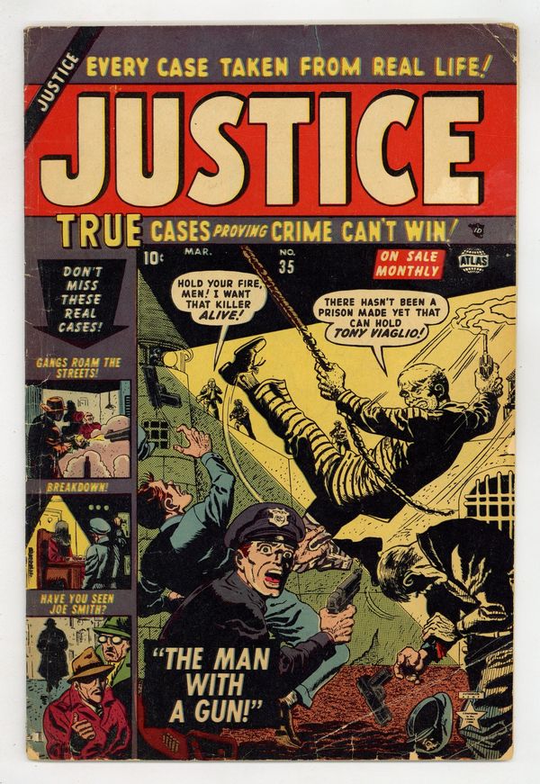 Cover by Sol Brodsky. Stories by Carl Wessler and unknown. Art by Gene Colan, Hy Rosen, Sol Brodsky and unknown. Every case taken from real life! Every case as thrilling as a newspaper headline! True cases proving crime can't win! In this issue: "The Man with a Gun" with story by Carl Wessler; "Have You Seen Joe Smith?" with art by Gene Colan; 2-page text story "Hot Rod Trial"; "Breakdown!" by Carl Wessler and Hy Rosen; and "Gangs Roam the Streets" with story by Carl Wessler and pencils by Sol Brodsky. 32 pages, full color. Cover price $0.10.