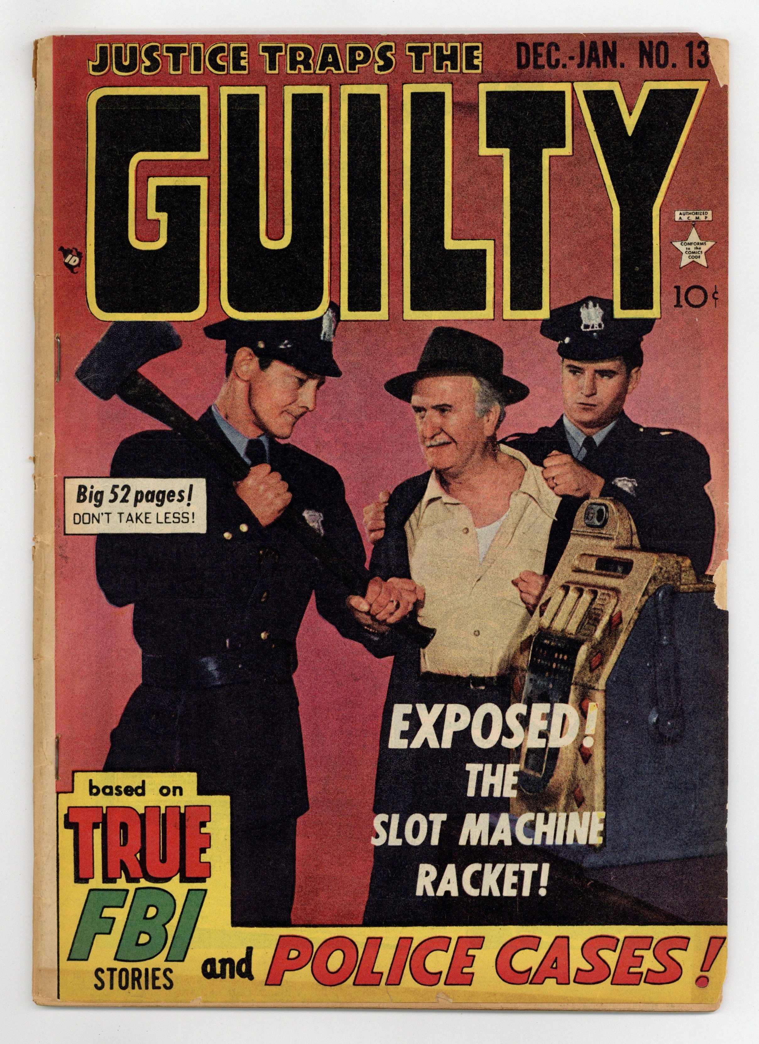 Photo cover. Slot Machine Payoff, art by George Gregg; a womans love for a killer made her a pawn in the murderous struggle between two mobs. Two-Bit Touch-Off, art by Rudy Palais; Frankie Ames was sure a looted vending machine would camouflage his four-alarm revenge plot. How the G-Men Got Their Name! featurette. Bite of Death. The Almost Perfect Crime text story. The Last Ride, art by Bernard Bail. One Way Willie. Charles Atlas comic strip ad. 52 pgs. $0.10. Cover price $0.10.
