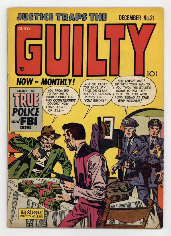 Cover by Jack Kirby. Art by Mort Meskin and C.C. Beck. Pioneering crime comic Justice Traps the Guilty was produced by the studio of comics legends Joe Simon and Jack Kirby, creators of Captain America. Struggling sweethearts Sharon and Jerry get caught up in a counterfeiting racket. Crimelord Harry Fontaine, who looks like Marvel's Kingpin, stays one step ahead of the cops. Ex-GI Marv vows to bring down a gang that swindles veterans out of housing loans. Also featuring a vintage ad for a bodybuilding "mini-gym" with art by Shazam creator C.C. Beck. Counterfeit!; Closeups; You Can't Kill Me!; O'Hara Had a Heart!; G.I. Housing Swindle; The Dead Can't Sleep! 48 pages, Full Color. Cover price $0.10.