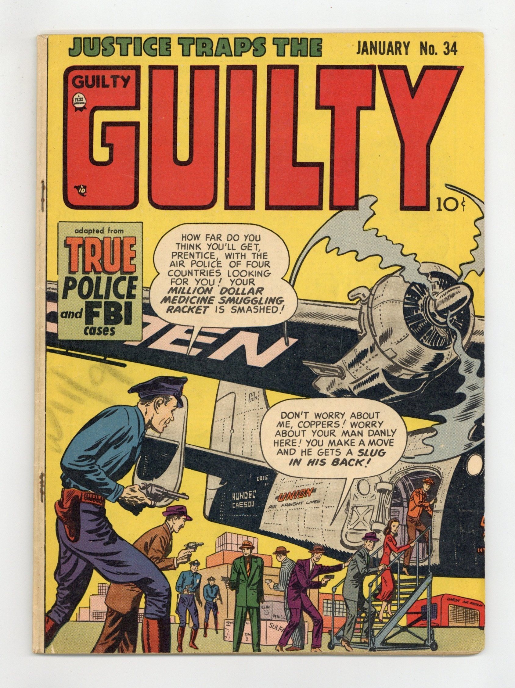 Published Jan 1952 by Prize/Headline.$31.50Cover by Marvin Stein. Art by Mart Bailey and others. Pioneering crime comic Justice Traps the Guilty was produced by the studio of comics legends Joe Simon and Jack Kirby, creators of Captain America. Dealers in black-market medicine flee the law in a plane with a hostage cop. An elderly ex-con returns to robbery and murder upon his release from prison, just to prove he hasn't lost his touch. A hood kills his twin brother and takes his place, but can't duplicate his sense of humor. Million Dollar Medicine Racket!; Old-Timer!; The Love That Kills!; Smart Baby; Closeups; Dead Mans Double! 40 pages, Full Color. Cover price $0.10.