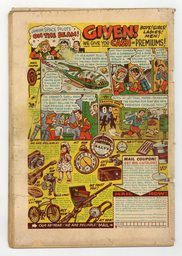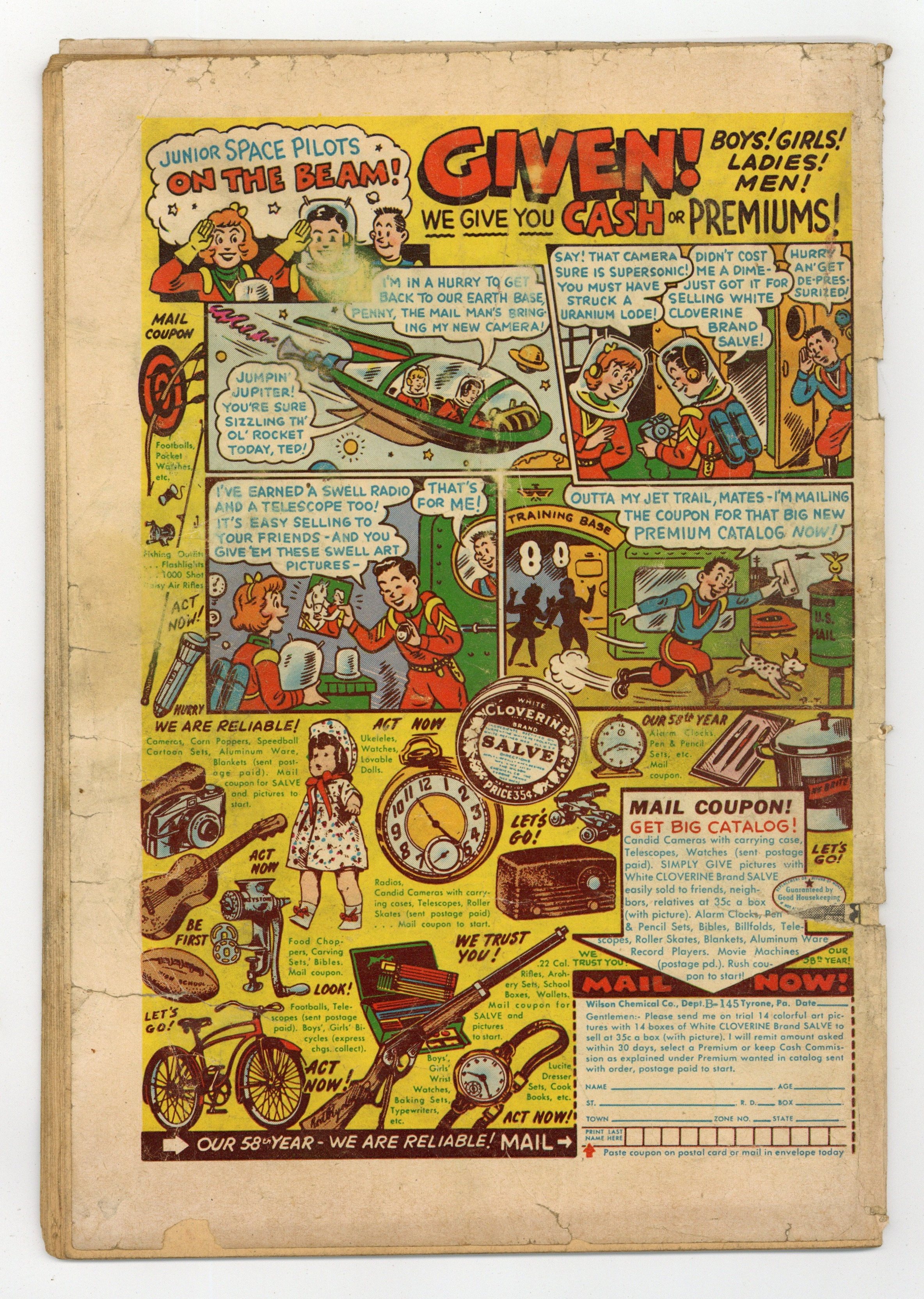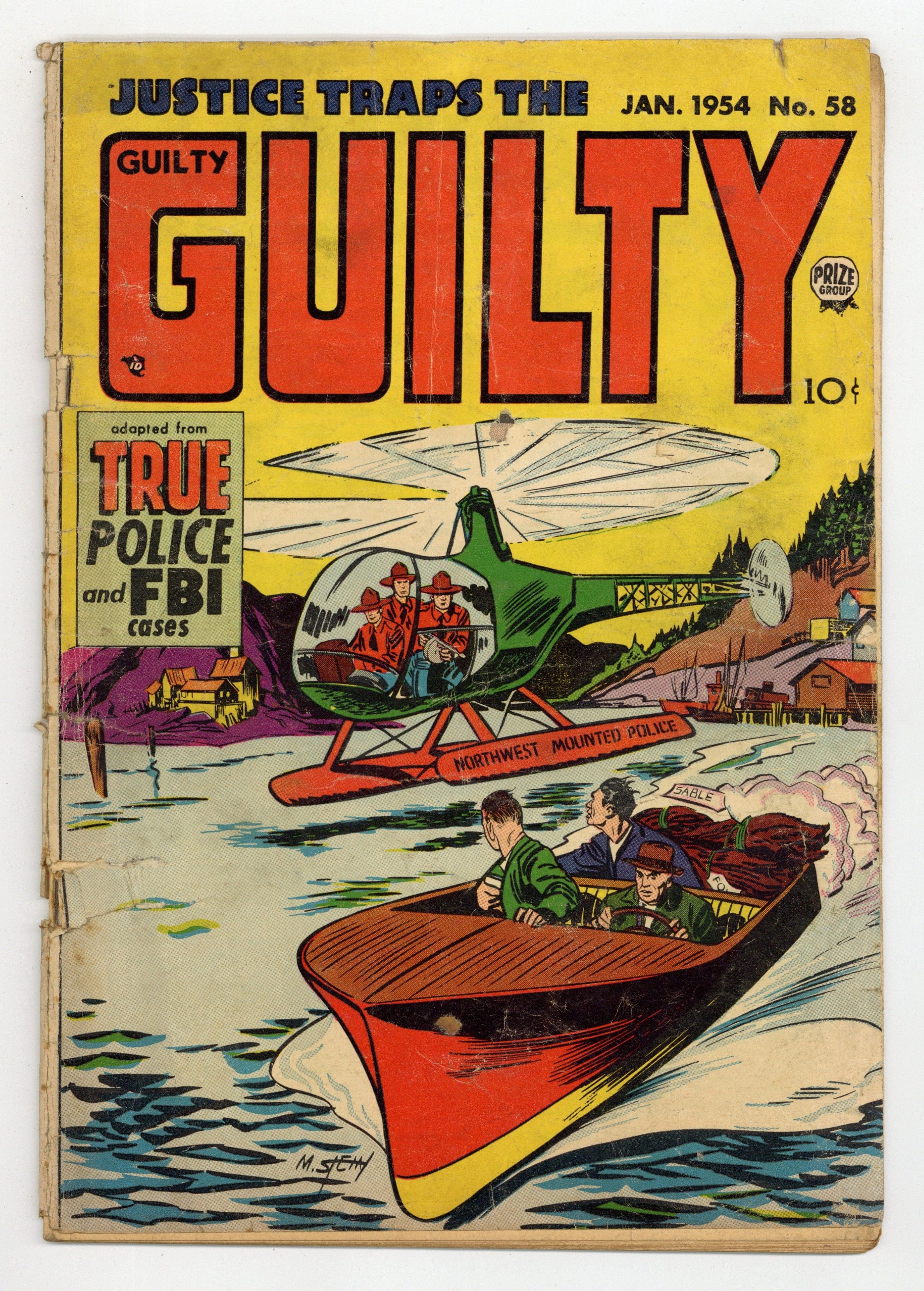 Cover by Marvin Stein. Art by Marvin Stein and Mort Meskin. Pioneering crime comic Justice Traps the Guilty was produced by the studio of comics legends Joe Simon and Jack Kirby, creators of Captain America. A con man hires a killer as his new partner - but first he must get rid of the old partner. An elderly shut-in plans to kill his neighbor to get his spot by the window. A man becomes a vicious thug after his brother is killed by cops during a robbery. Art from this issue is featured in Dr. Fredric Wertham's 1954 anti-comics classic Seduction of the Innocent, illustration #14, with the caption, "Treating police contemptuously is a comic-book commonplace." The Swindler; Something to Kill for!; The Last Laugh; Closeups; Desert Justice; Cotton Clue; Two-Gun Crowley. 32 pages, Full Color. Cover price $0.10.