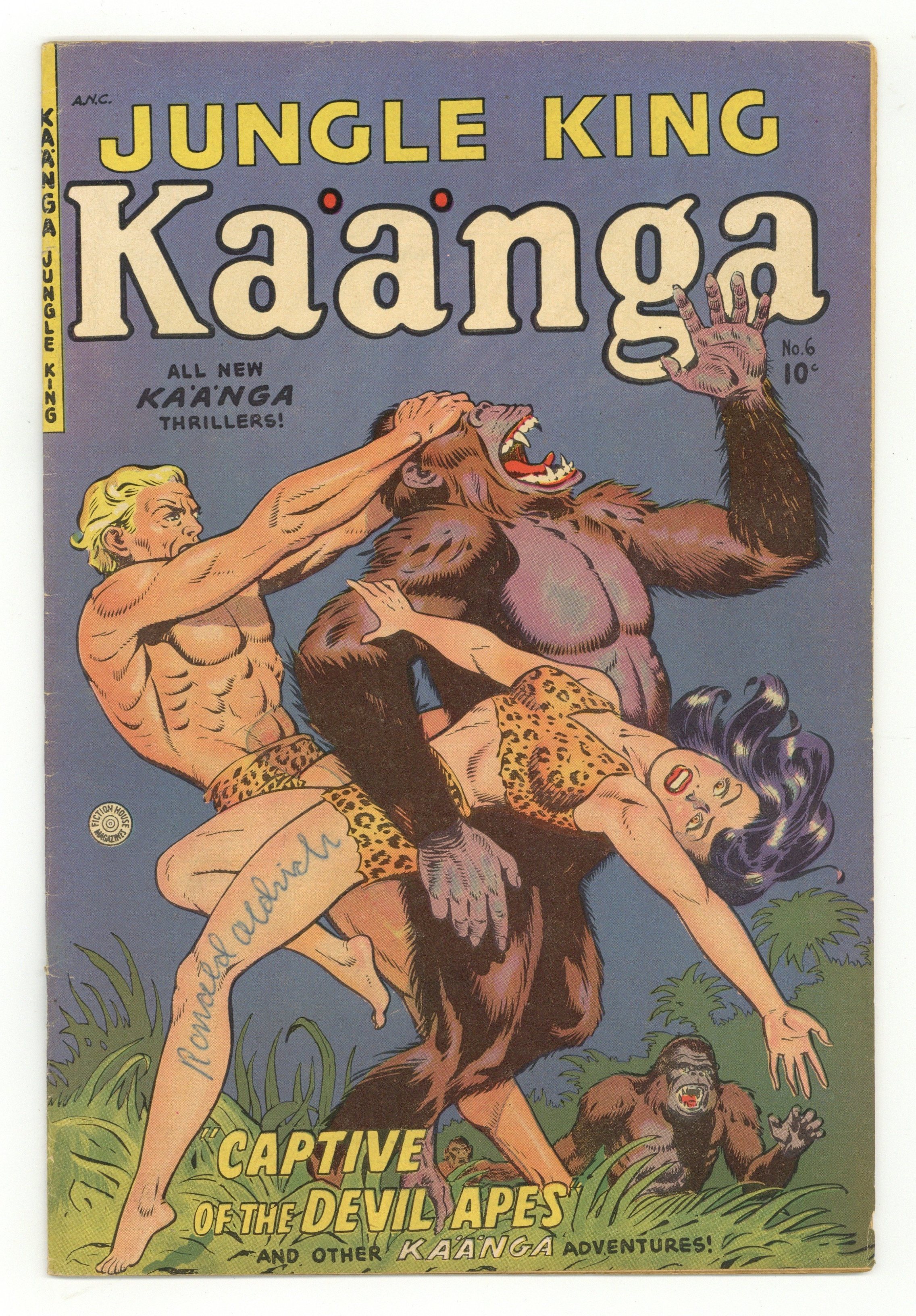 Published 1950 by Fiction House.$63.00Untitled story, pencils by Robert Webb; Kaänga and Ann help restore twin bird priestesses Tantia and Fortuna to the rule of their ancient city. Untitled story, pencils by Robert Webb; A crocodile cult takes Ann and Cynthia Kenyon, daughter of Kaänga's friend Captain Kenyon, to use as sacrifices to their crocodile god; Kaänga rescues the women and traps the cultists in a blind canyon for arrest by the commissioner's men. Untitled story; Bombura of the Zanzulus and L'gora of the tree people plot to pit their people against each other in a war that will lead to the overthrow of the queen of the tree people; Kaänga works for peace between the tribes but is forced to fight both of the plotters. 36 pgs., full color. Cover price $0.10.