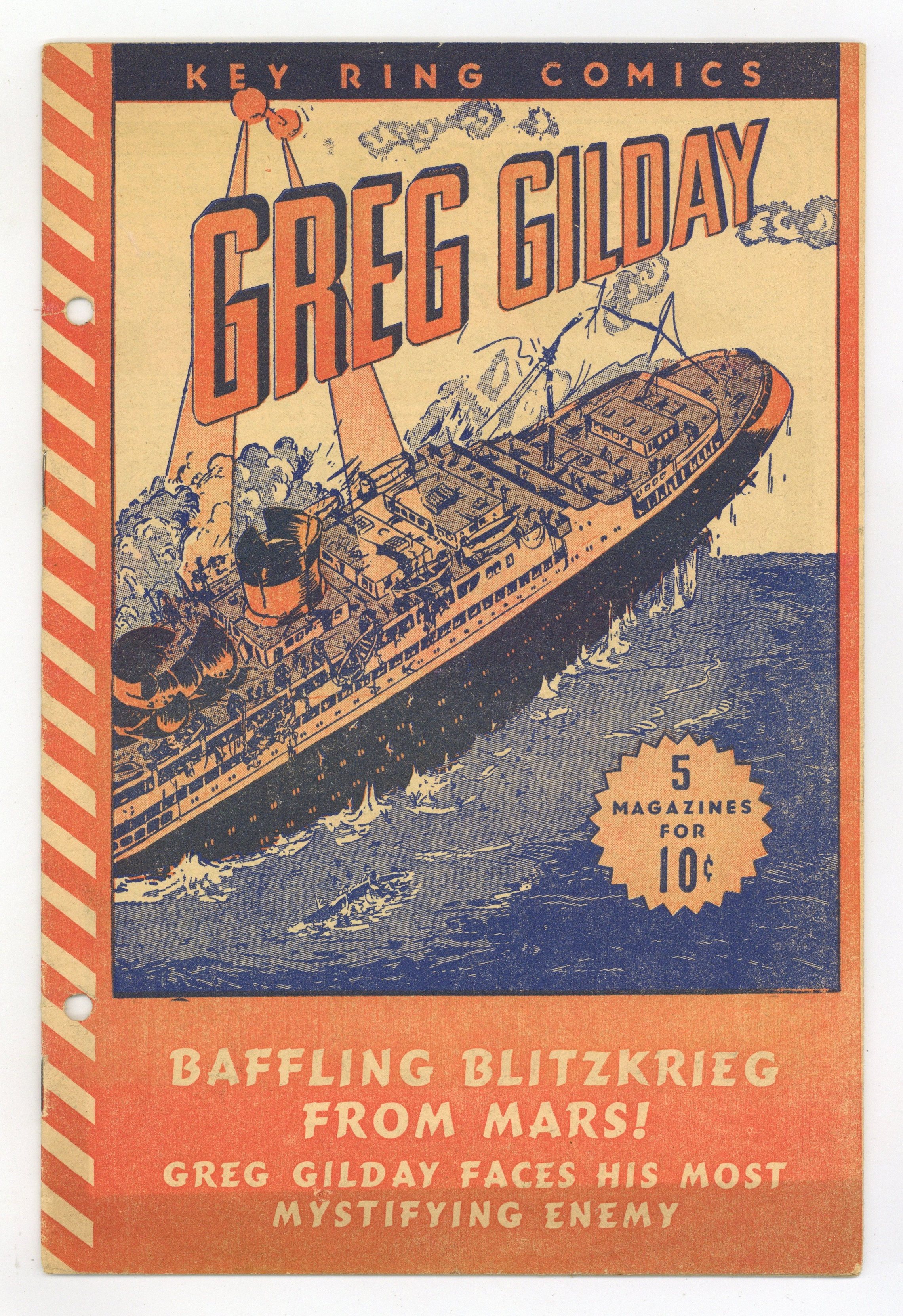 RED FRAME VARIANT. Dell sold Greg Gilday along with four other comics (Sky Hawk, Viking Carter, Sleepy Samson, Radior) as a set of 5 comics for 10 cents in 1941. This issue reprints War Comics #2. 7-in. x 10.25-in; 2-color printing; 16 pages-all newsprint. Cover price $0.10.