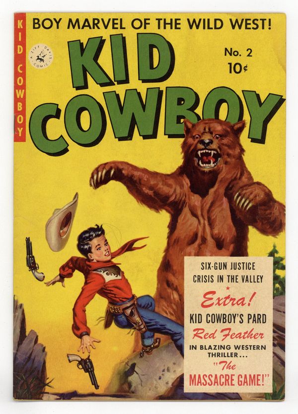 Painted cover by Allen Anderson. Stories and art by John Buscema, Bob Stuart, Joe Maneely, John Celardo and Bob Brown. Baby-faced gunslinger Kid Cowboy fights for justice in the Old West with his sidekick, Red Feather. When Kid Cowboy and Red Feather intervene in a water war, they become the targets of outlaw Mal Thomas. Bound to a tree by an outlaw, Kid Cowboy is at the mercy of an approaching grizzly, in a story with early art by future Marvel and Conan legend John Buscema. Kid Cowboy tries to get the goods on slippery outlaw Jeb Matthews. Plus the stories of Annie Oakley, Capt. John Smith and Pocahontas. Heroes of the West: Annie Oakley; Crisis In the Valley; The Grizzly's Debt!; Tom Smith of Abilene; Red Feather: The Massacre Game; Six-Gun Justice; Capt. John Smith and Pocahontas! 32 pages, Full Color. Cover price $0.10.