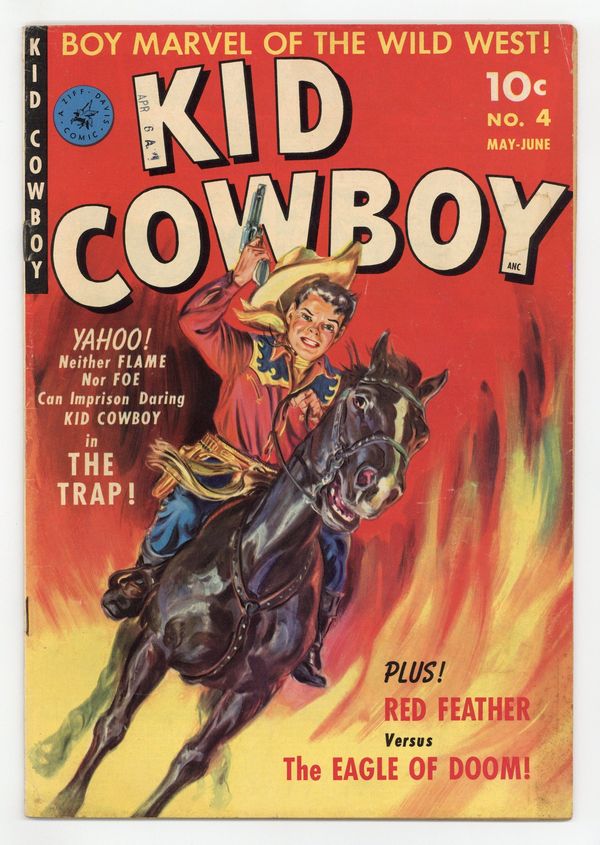 Painted cover by Norman Saunders. Stories and art by Gene Colan, Ross Andru, Leonard Starr, and John Celardo. Baby-faced gunslinger Kid Cowboy fights for justice in the Old West with his sidekick, Red Feather. Kid Cowboy mounts a desperate plan to keep outlaw Blackie Gordon from crossing the border, in a story with early art by future Marvel legend Gene Colan. A US Cavalry colonel goes rogue, and when Kid Cowboy and Red Feather try to stop him, they face the firing squad. Plus the story of Buffalo Bill Cody, and one-pagers with early art by future Marvel legend Ross Andru. Heroes of the West: Buffalo Bill Cody; The Colonel's Code; The Old Chisholm Trail; Thundering Herds; Red Feather: Eagle of Doom!; Cameron's Cowboys; "Windwagon" Thomas; Branding Time. 32 pages, Full Color. Cover price $0.10.
