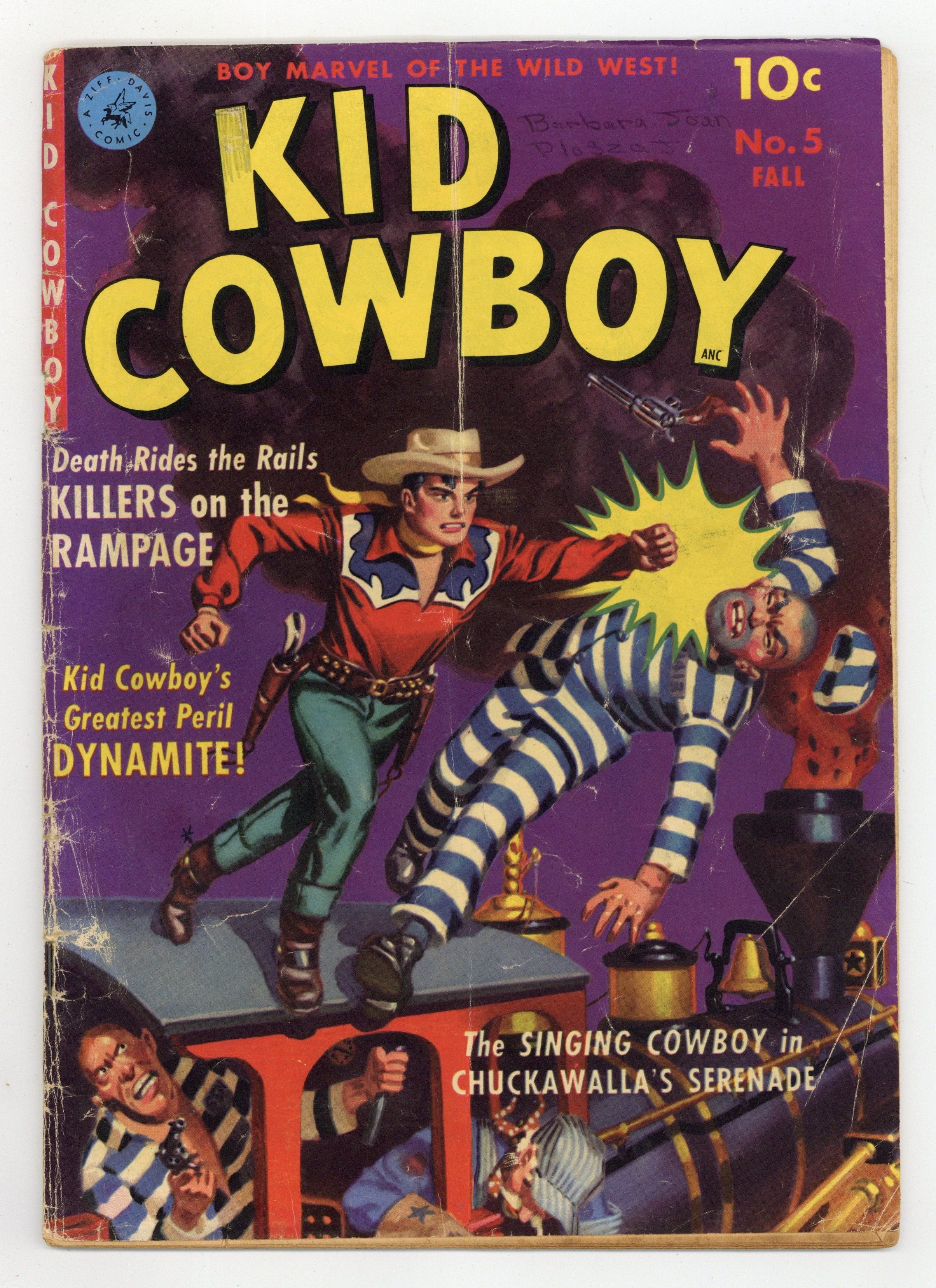 Stories and art by Gene Colan, Matt Baker, Ross Andru, Dave Berg, Jack Sparling and Bob Brown. Baby-faced gunslinger Kid Cowboy fights for justice in the Old West with his sidekick, Red Feather. Kid Cowboy must stop escaped convicts from hijacking a train and causing a collision with another locomotive, in a story with early art by future Marvel legend Gene Colan. The Gibson Gang steals horses from Kid Cowboy's ranch and injures Red Feather, so the Kid must go after them alone. Plus one-pagers with early art by future Marvel legend Ross Andru and good-girl art legend Matt Baker. And a Little Sheriff comedy by future MAD artist Dave Berg. Dude Ranch Days; Dynamite!; Killers on the Rampage!; Dishonest Crook; The Lost Dutchman!; The Singing Cowboy: Chuckawalla's Serenade; The Little Sheriff: Pot Luck. 32 pages, Full Color. Cover price $0.10.