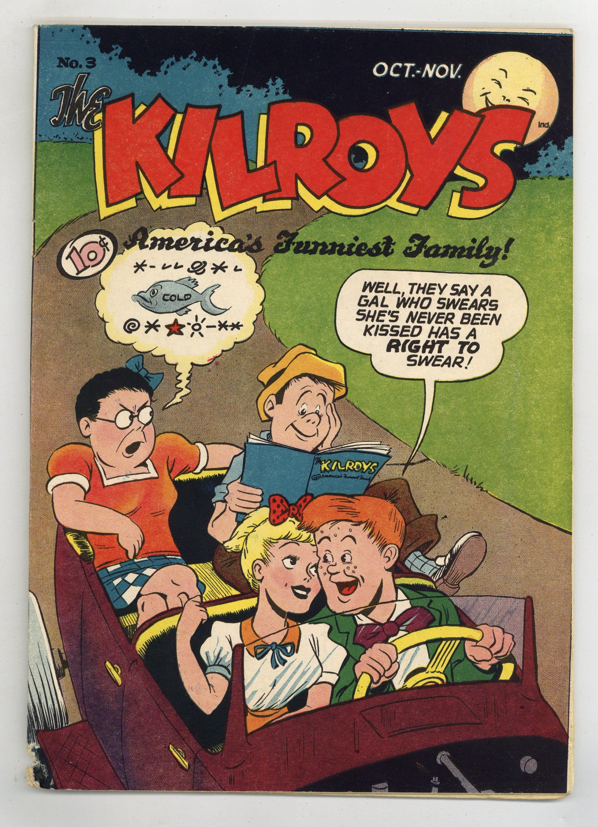 Stories by Al Hartley and others. Art by Al Hartley and others. The Kilroys (Americas Funniest Family!) combined the family humor of the then-new sitcom format with Archie-style teen hijinks featuring Katie, Natch, and pal Solid Jackson. The early covers made use of the Kilroy Was Here joke meme from World War II. Natch is in a jam after he leaves the house without any money; Natch is stranded in his pajamas after his car runs out of gas; Natch and Katie think Pops Kilroy is wanted for bank robbery. Something to Remember; No Vacancies; Little Sister, Big Problem; The Midnight Alarm; Peace -- It's Wonderful!; The Sleepwalker; Solid Jackson: But, Officer ---; Wanted, Dead or Alive; Kollege Kapers; That New Ball-Point Job. 48 pages, Full Color. Cover price $0.10.