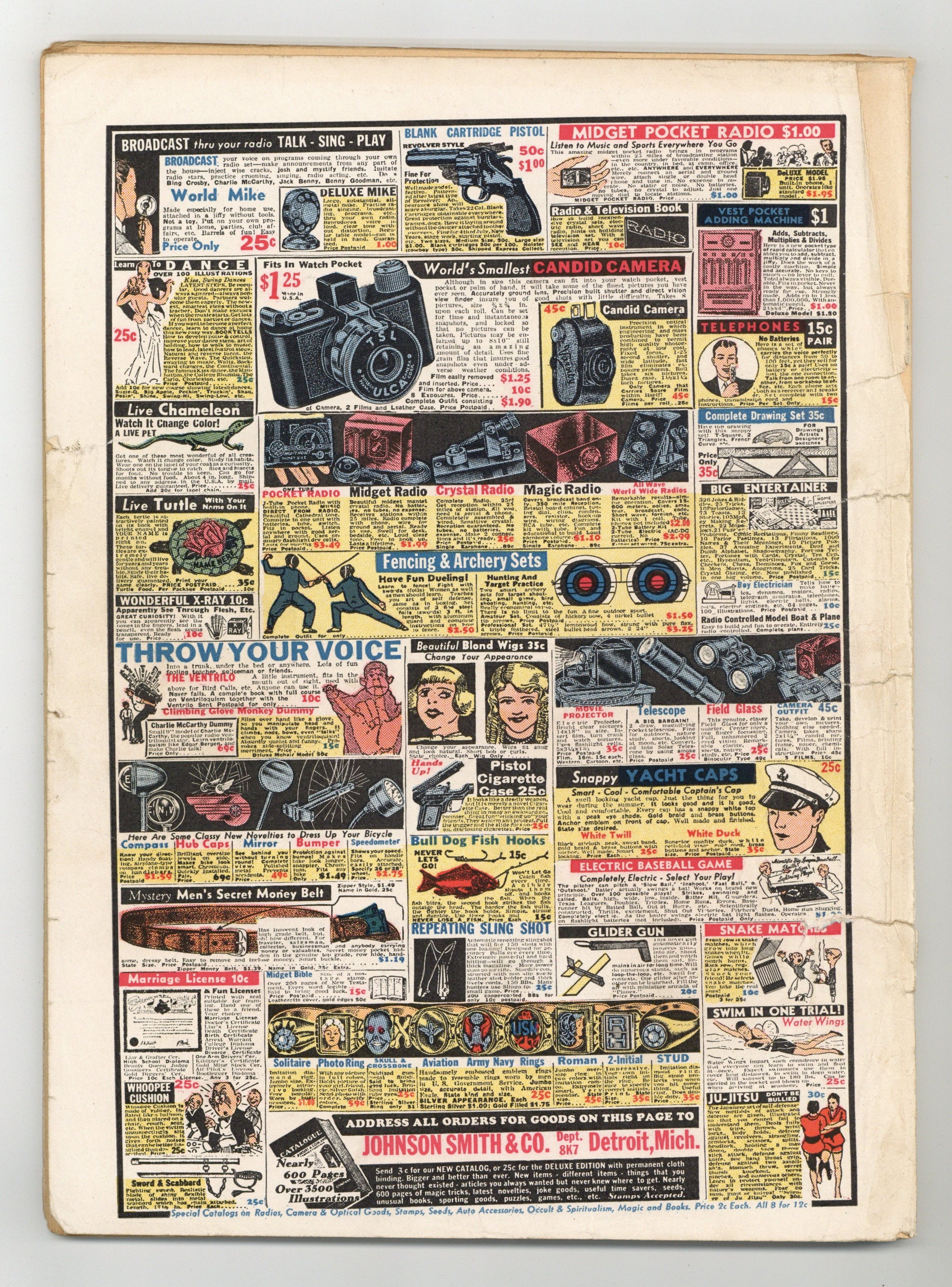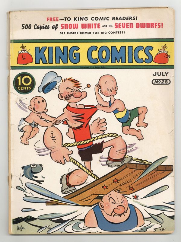 Cover by Joe Musial. Edited by Ruth Plumly Thompson (sometimes credited as Jo King). Stories and art by William Ritt, Clarence Gray, Brandon Walsh, Nicholas Afonsky, Carl Anderson, Jack Burnley, R. J. Scott, Marge Buell, Eddie Sullivan, Charlie Schmidt, Lee Falk, Phil Davis, E. C. Segar, George McManus, Otto Soglow, Eddie Rickenbacker, Clayton Knight, Romer Grey, Charles Flanders, Ruth Plumly Thompson, Frank Miller, Don Moore and Alex Raymond. Pioneering comics publisher David McKay presents an anthology series featuring reprints of King Features Syndicate comic strips. Popeye gets into a custody battle over Swee'pea; Flash Gordon turns one of Ming's Armotanks against him. Also features early art by Little Lulu creator Marge Buell, and the little-seen E. C. Segar strip Sappo ("Heh! Heh! Heh!"). Brick Bradford; Little Annie Rooney; Henry; Sport Features; Scott's Scrapbook; Hall of Fame of the Air; Sentinel Louie; Radio Patrol; Mandrake the Magician; Thimble Theatre; Flash Gordon; Bringing Up Father; The Little King; Ted Towers, Animal Master; King of the Royal Mounted; Barney Baxter in the Air; Sappo; King Kojo Acquires a Court Poet! 68 pages, Full Color. Cover price $0.10.