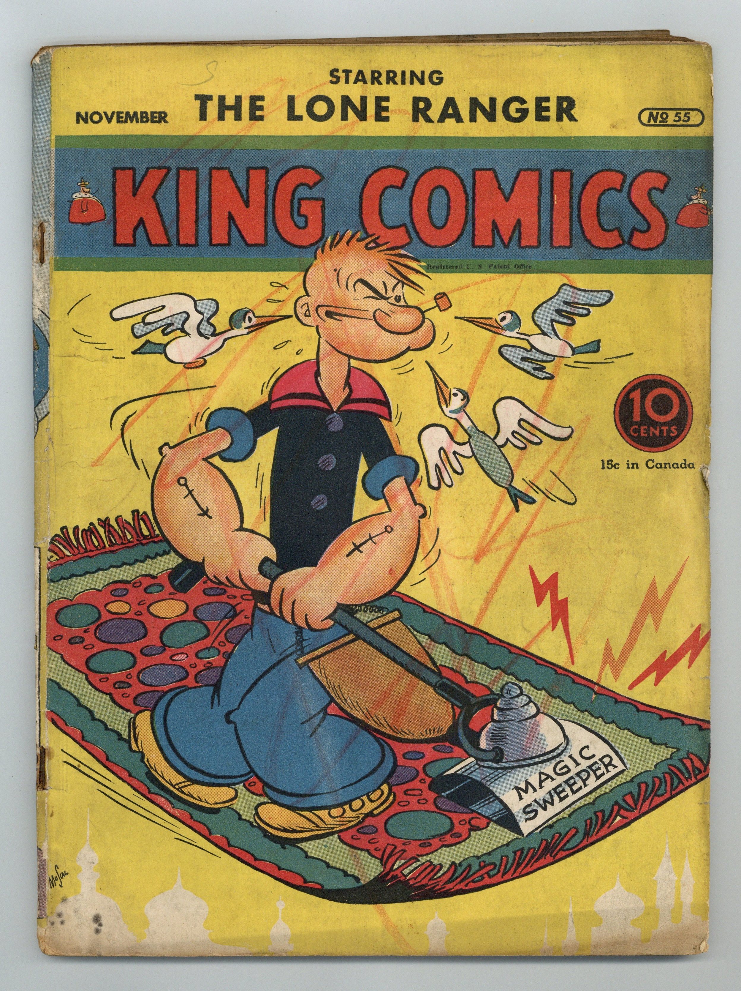 Cover by Joe Musial. Edited by Ruth Plumly Thompson (sometimes credited as Jo King). Stories and art by William Ritt, Clarence Gray, Fran Striker, Brandon Walsh, Nicholas Afonsky, Carl Anderson, Jack Burnley, R. J. Scott, Eddie Sullivan, Charlie Schmidt, Lee Falk, Phil Davis, E. C. Segar, George McManus, Otto Soglow, Eddie Rickenbacker, Clayton Knight, Romer Grey, Jim Gary, Charles Flanders, Ruth Plumly Thompson, Don Moore and Alex Raymond. Pioneering comics publisher David McKay presents an anthology series featuring reprints of King Features Syndicate comic strips. Mandrake the Magician fears that mountain climber Marsha Dale will encounter the Ghost Bear. Brick Bradford; The Lone Ranger; Little Annie Rooney; Henry; Sport Features; Scott's Scrapbook; Radio Patrol; Mandrake the Magician; Thimble Theatre; Flash Gordon; Bringing Up Father; The Little King; King of the Royal Mounted. 64 pages, Full Color. Cover price $0.10.