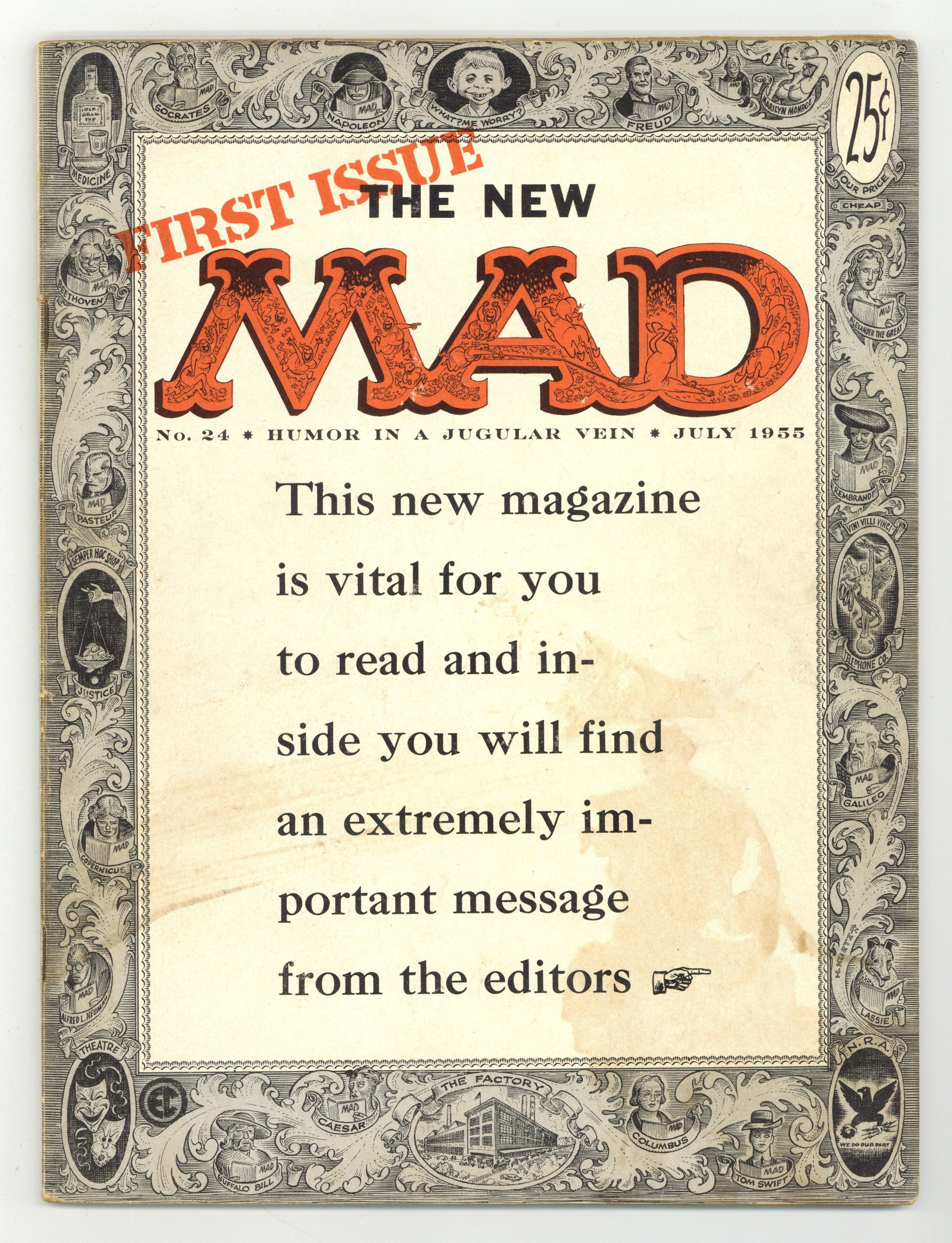 Cover art by Harvey Kurtzman. Published by William Gaines and edited by Harvey Kurtzman, Mad Magazine #24 begins a new era, parodying various elements of life, including popular culture. Previously, Mad was a comic book. "Extremely Important Message From The Editors," script and art by Harvey Kurtzman; Message is, "Please Buy This Magazine." "She Wanted To Drown Her Troubles," art by Wally Wood; Phony ad for movie "Gluggle!" "Is A Trip To The Moon Possible?", script by Harvey Kurtzman, art by Wally Wood; A humorous look at the problems and joys of travel to the moon. "Report From Russia" article by Hans Christian Andersen; A supposed look into Russian thought...in Russian (Cyrillic script). "Out of The Frying Pan And Into The Soup" text story by Ira Wallach, art by Bernie Krigstein. "Wrestling," script by Harvey Kurtzman, art by Jack Davis; A humorous look at professional wrestling matches, using all the stereotypes in the sport. Single strip parodies of various newspaper comics, script by Harvey Kurtzman, art by Bill Elder. "Classy Crimes #138: Who Put The Strichnine In Mrs. Murphy's Husband?" text story by Bernard Shir-Cliff, art by Bill Elder. "Anyone Can Build This Coffee Table," script by Harvey Kurtzman, art by Jack Davis; Bogus instructions on how to build a coffee table complete with a potted plant sitting on the table. "Is This Your Life?", script by Harvey Kurtzman, art by Bill Elder; Melvin Furd is nearly killed during the show, which features family, friends, enemies and someone he doesn't even know; Parody of tv show "This Is Your Life." "Vera's Cruz," script by Harvey Kurtzman, art by Jack Davis; Two men sign on to guard a gold and guns shipment, but are also out to steal it for themselves. 68 pgs., B&W. Cover price $0.25.