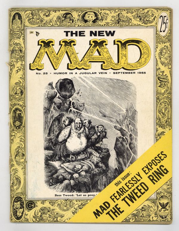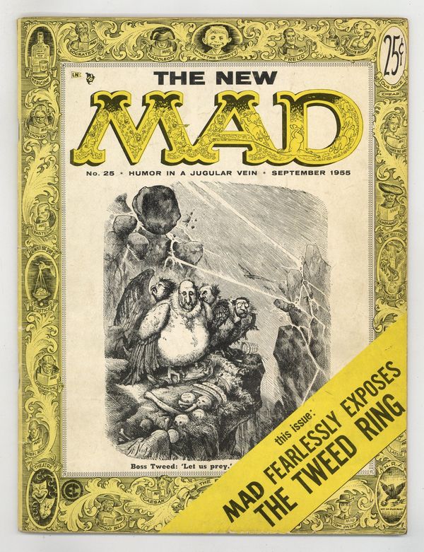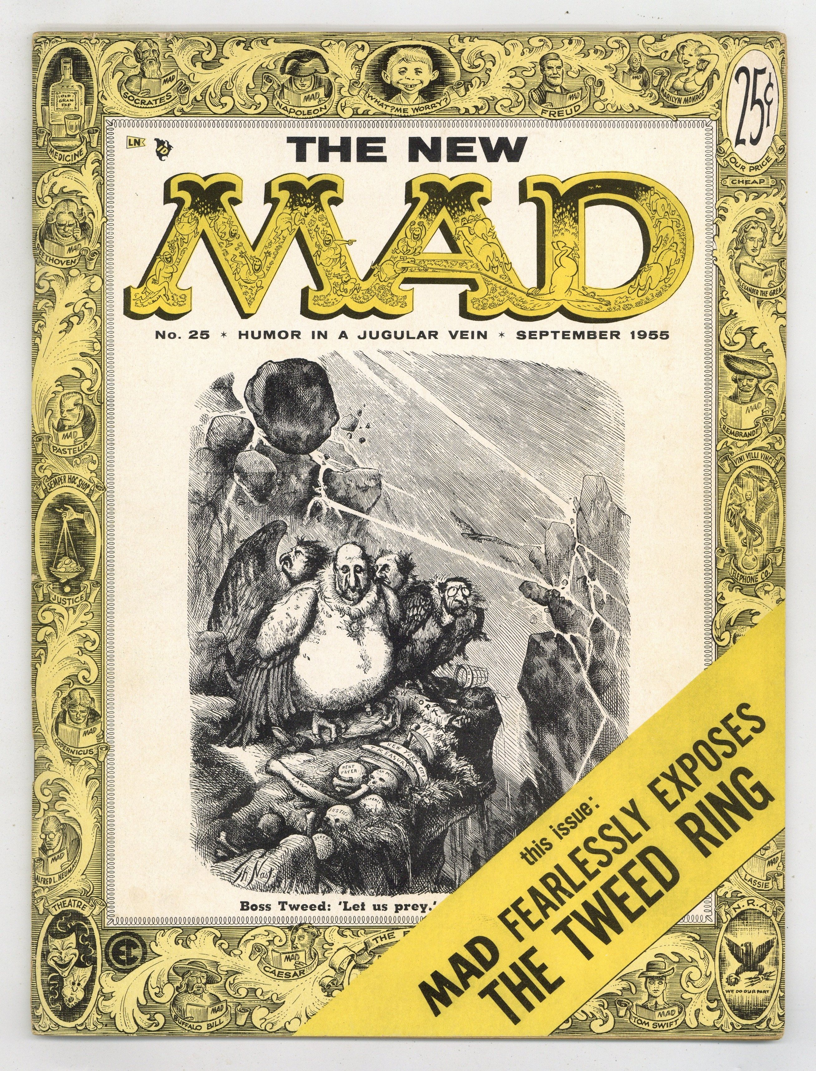 Cover art by Thomas Nast and Harvey Kurtzman (frame). "Radiodetectiveland" article by Harvey Kurtzman, art by Bill Elder; A look at the crazy neighborhood inhabited by the average radio show detective. "The Jack E. Glisten Story," script by Harvey Kurtzman, art by Wally Wood; A behind-the-scenes look at how the Jack E. Glisten show is produced; Parody of the Jackie Gleason tv show. "Very Square Dance"; Lyrics by Steve Allen presented without the musical score. "Baseball...Science Or Skill?", script by Al Jaffee, art by Jack Davis; Comparison of the scientific and instinctive methods of baseball team management: both fail. "Anyone For Wrist Slashing?", script by Stan Freberg, art by Wally Wood; Excerpt from a movie magazine and a "screenplay" by Stan to show contrasts between his characters and real life. "Was George Washington "George"?", script by Harvey Kurtzman, art by Bill Elder; Exposé type articles on George Washington, John Smith and Snow White. "MAD Awards," script by Harvey Kurtzman, art by Bill Elder; Awards for best tv commercials. "They Built Their Dream-House Singlehanded," script by Harvey Kurtzman, art by Wally Wood; Story of how the Countersunks built their not-quite-so-dream house. "The Stark Club," script by Harvey Kurtzman, art by Jack Davis; A tour through the nightly happenings at the Stark Club. "The Blackboard Jumble," script by Harvey Kurtzman, art by Wallace Wood; Scenes from the movie and a recommendation for solving the real life violence problem in schools; Parody of movie "Blackboard Jungle." 60 pgs., B&W. Cover price $0.25.