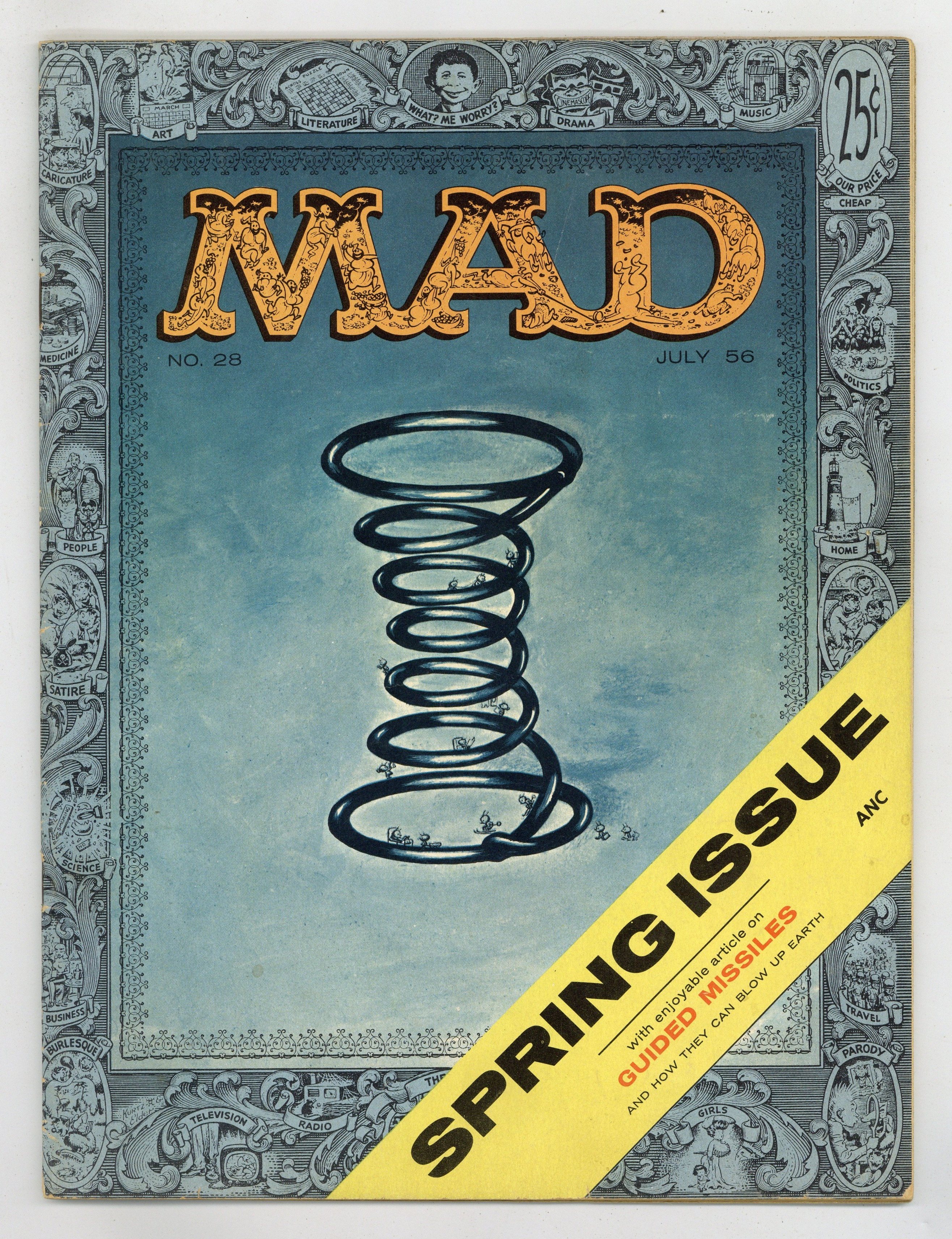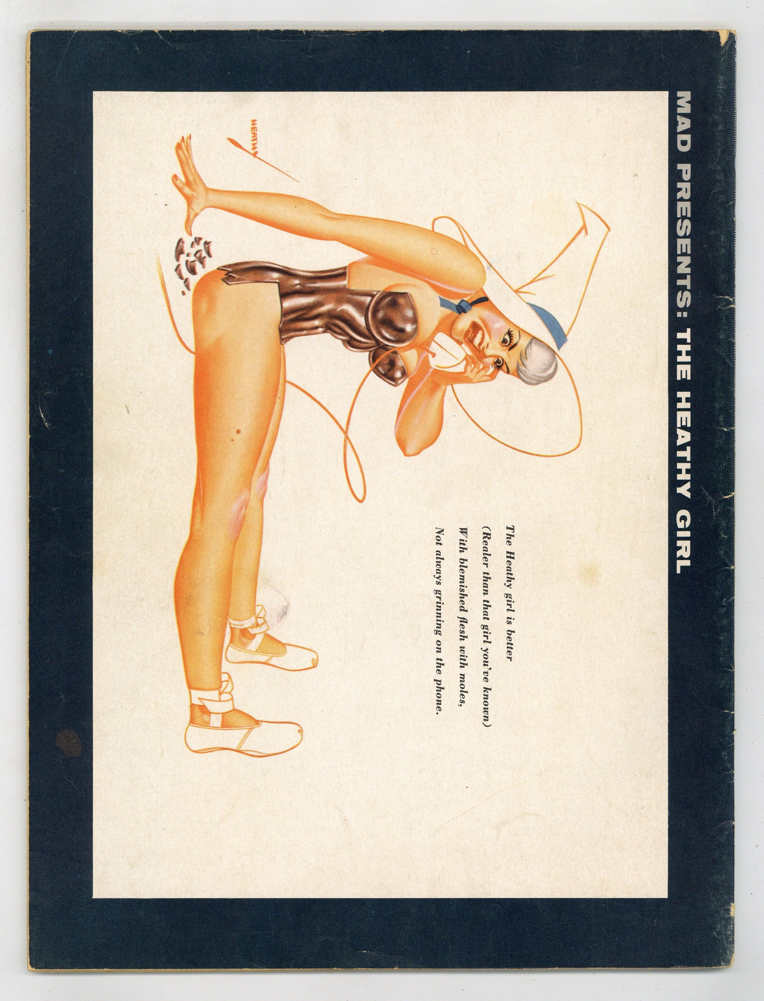 Cover art by Wally Wood, Harvey Kurtzman, and Bill Elder. "He Rose Tattooed," art by Wally Wood; Parody of movie "The Rose Tattoo." "The Race is On for the Super Guided Missile," script by Al Jaffee, art by Al Jaffee, Jack Davis, and Wally Wood; Shows various parts of the space race between the US and USSR, with ultimate consequences of missile use. "Children's Primer," art by Bill Elder; Parody of the type of poetry written by 19th century poet, Eugene Field, The Children's Poet. "Comic Books," script by Harvey Kurtzman, art by Wally Wood (as Woodhawk); The Black And Blue Hawks stage a mutiny; A parody of Blackhawk comic books. "Young Men's Spring Fashions for 1956," art by Jack Davis; Comparison of fashions for Ivy League class with those worn by street gangs. "Your Income Tax," script by Bernard Shir-Cliff, art by Bill Elder; Bad advice for filling out your federal income tax return. "The Life of General Homer T. 'Old Hominy' Shotbag," script by Ed Fischer, art by Ed Fischer and Seltz; Highlights of the life of Civil War general Homer T. Shotbag, from childhood to fame. "Talk," art by Wally Wood; Comparisons of what you think overseen conversations are, with what they actually are. "Million Dollar Horse," script by Al Jaffee, art by Jack Davis; Story of a celebrity race horse, showing the care taken with him versus the poor working conditions of his caretakers. "Medical," art by Bill Elder; Lance needs a tonsillectomy, from which he recovers in great shape, but still can't play the violin well. 60 pgs., B&W. Cover price $0.25.