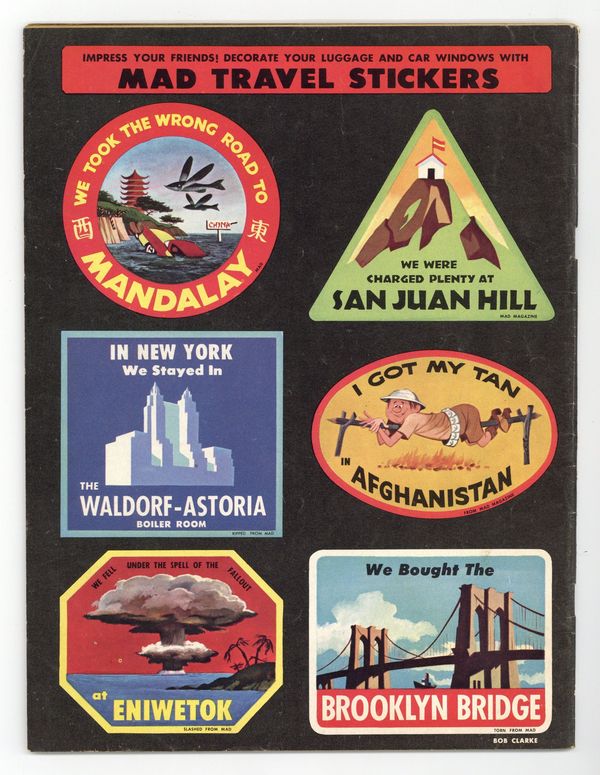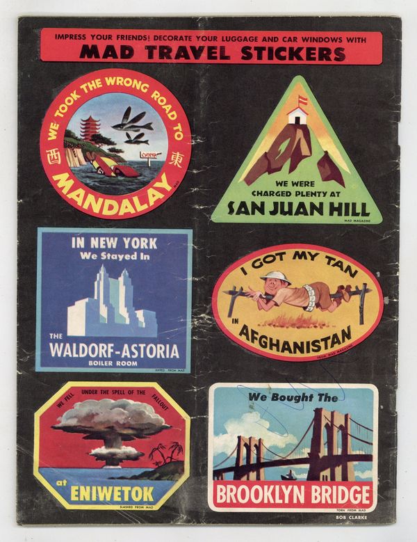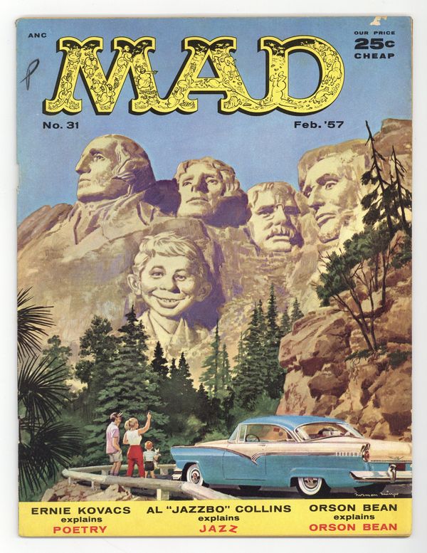 $51.00Painted cover art by Norman Mingo. "The New Marilyn Marone," art by Wally Wood; A comparison of Marilyn's career before and after acting lessons. "Field & Scream," art by Jack Davis; Excerpts from hunters' magazine, including some phony ads. "Why I Write Poetry," script by Ernie Kovacs (as Percy Dovetonsils), art by Jack Davis; A short article on why he writes poetry followed by the poem "Ode To Stanley's Pussycat." "What They're Saying Around The Solar System," art by Basil Wolverton; Opinions of earth culture by beings from other bodies in our solar system. "What's All This Jazz About Jazz," script by Al "Jazzbo" Collins, art by Wally Wood; In an interview, Al tells something about the origins and meaning of jazz and introduces his jazz pets. "Future TV Ads," script and art by Don Martin; Phony ad storyboard for Billie's Rope Mart. "MAD's Ink Blot Test," art by Kelly Freas and Bill Elder. "Don Giovanni," script by Nick Meglin, art by Wally Wood; The story of the comic opera Don Giovanni is told with special emphasis on what makes it funny. "Future TV Ads," script and art by Don Martin; Phony ad storyboard for Ringwort's Rat Poison Pills. "Orson Bean Opens His Family Album," script by Orson Bean, art by Jack Davis; Vignettes of Orson's family from Revolutionary times to present. 52 pgs., B&W. Cover price $0.25.