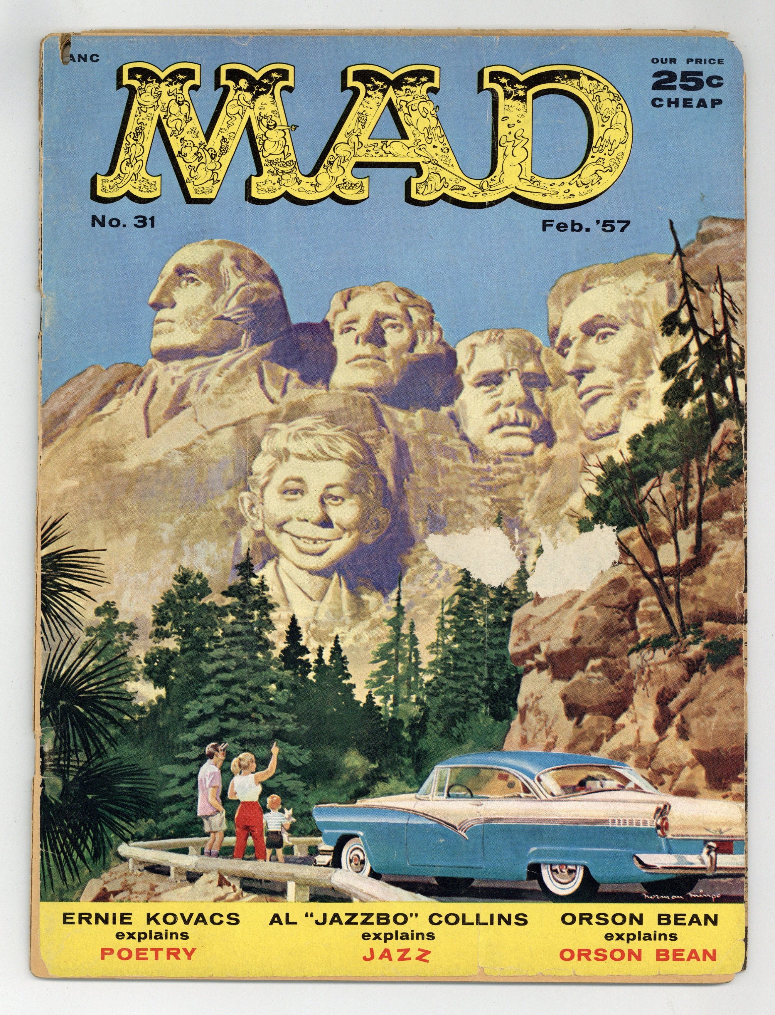 Painted cover art by Norman Mingo. "The New Marilyn Marone," art by Wally Wood; A comparison of Marilyn's career before and after acting lessons. "Field & Scream," art by Jack Davis; Excerpts from hunters' magazine, including some phony ads. "Why I Write Poetry," script by Ernie Kovacs (as Percy Dovetonsils), art by Jack Davis; A short article on why he writes poetry followed by the poem "Ode To Stanley's Pussycat." "What They're Saying Around The Solar System," art by Basil Wolverton; Opinions of earth culture by beings from other bodies in our solar system. "What's All This Jazz About Jazz," script by Al "Jazzbo" Collins, art by Wally Wood; In an interview, Al tells something about the origins and meaning of jazz and introduces his jazz pets. "Future TV Ads," script and art by Don Martin; Phony ad storyboard for Billie's Rope Mart. "MAD's Ink Blot Test," art by Kelly Freas and Bill Elder. "Don Giovanni," script by Nick Meglin, art by Wally Wood; The story of the comic opera Don Giovanni is told with special emphasis on what makes it funny. "Future TV Ads," script and art by Don Martin; Phony ad storyboard for Ringwort's Rat Poison Pills. "Orson Bean Opens His Family Album," script by Orson Bean, art by Jack Davis; Vignettes of Orson's family from Revolutionary times to present. 52 pgs., B&W. Cover price $0.25.